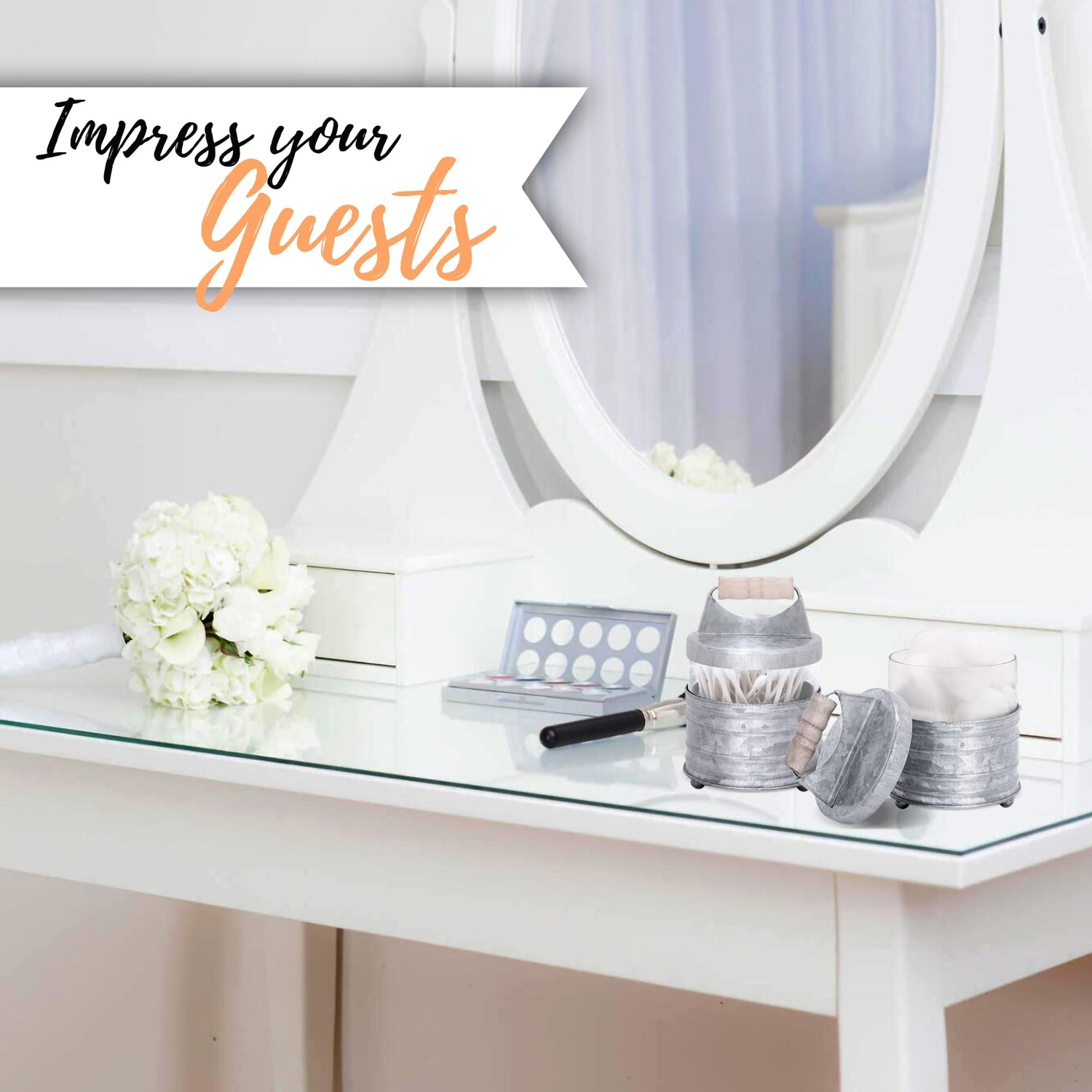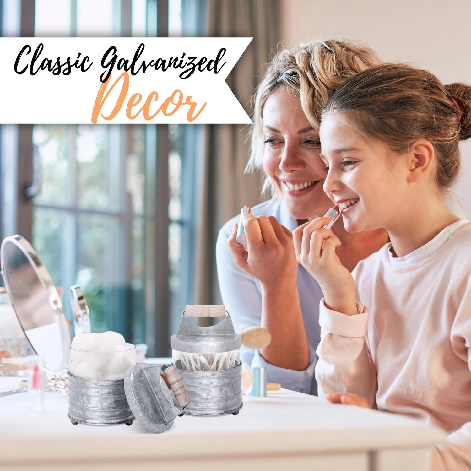 - 【Sublime Galvanized Finish】Keep those cotton balls and q-tips organized and prettily contained in these adorable farmhouse bathroom containers. The classic metallic finish is heavy duty, yet beautifully coated to prevent corrosion and rust for years. Sturdy & Pretty farmhouse bathroom shelf decor.