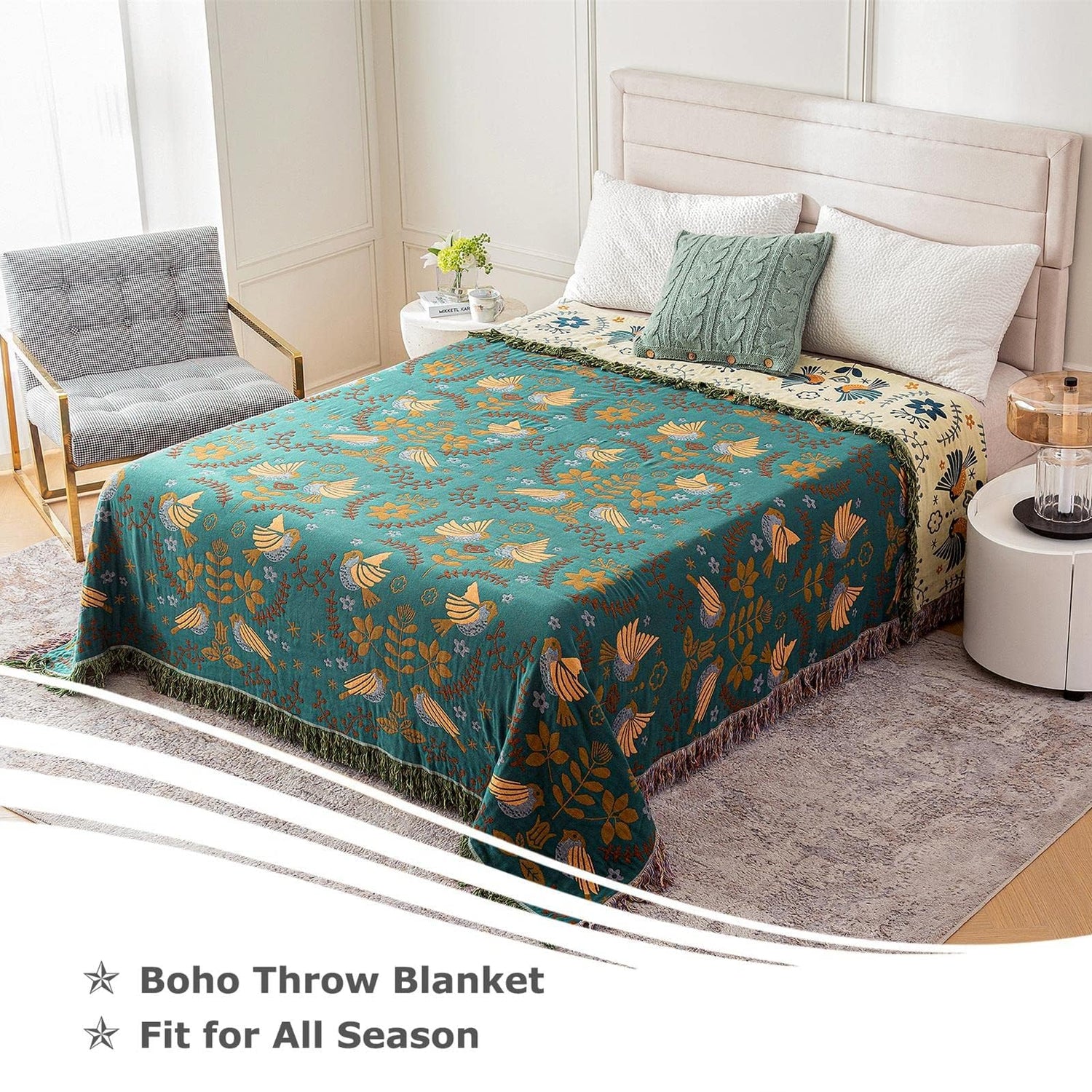Boho Throw Blanket for Bed 100% Cotton Ultra Soft Rustic Quilt Fall Blanket Bird Floral Printed Farmhouse Decor Large Bed Blankets,60"×80" All Season Rustic Throw for Sofa Couch Chair