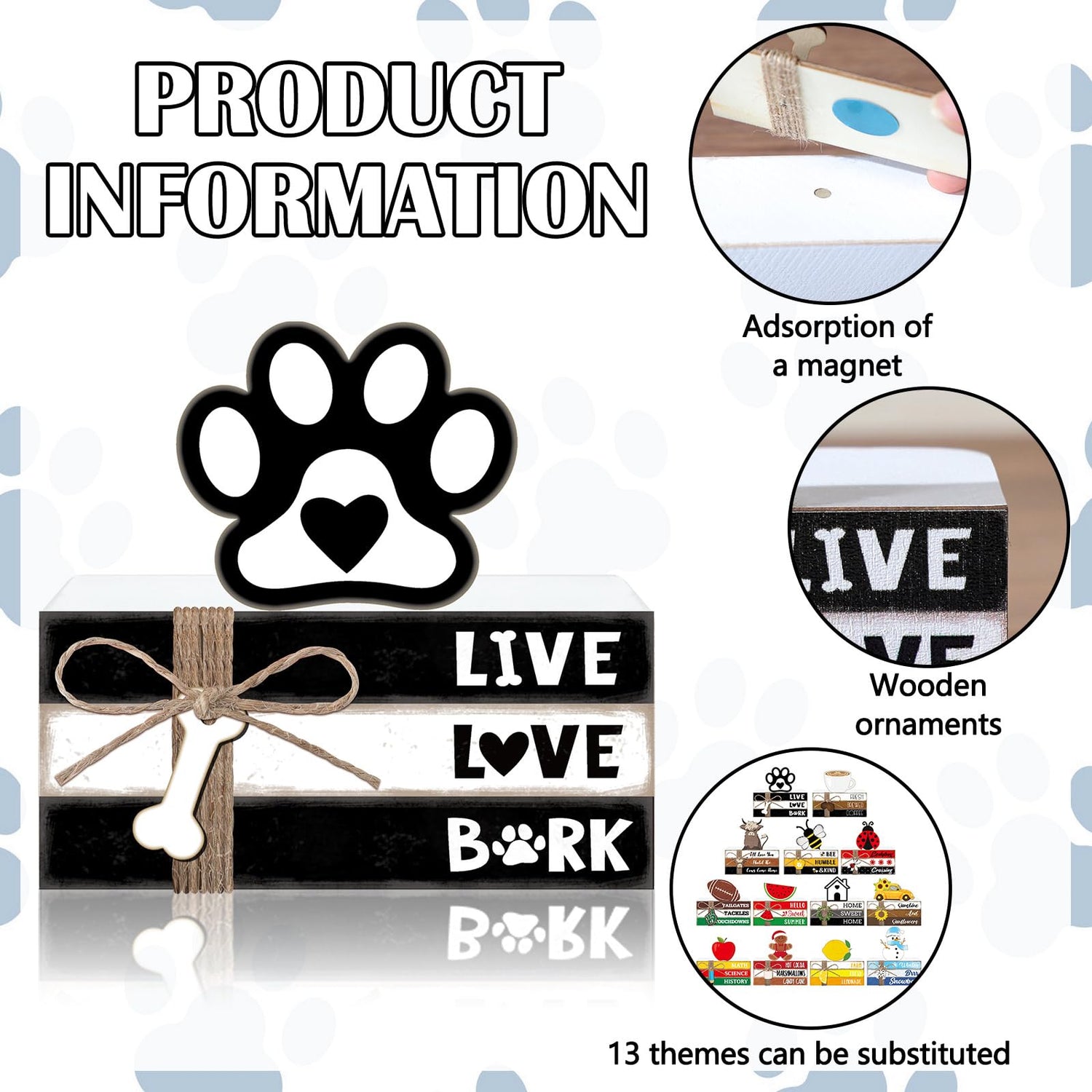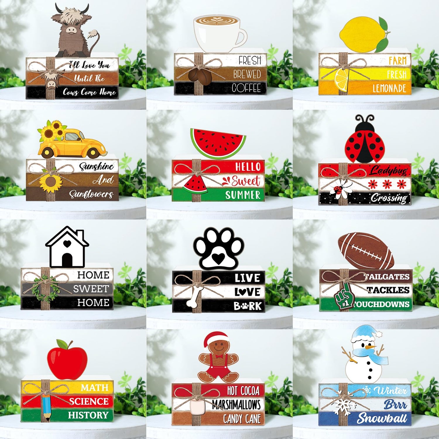Briwooody 27 Pcs Interchangeable Table Decor Seasonal Bee Lemon Highland Cow Sign Farmhouse Mini Wood Book Stack Spring Summer Tiered Tray Decor for Home Office Desk Shelf Coffee Bar(Classic Style)