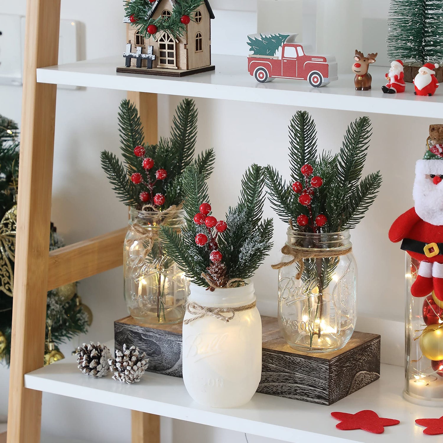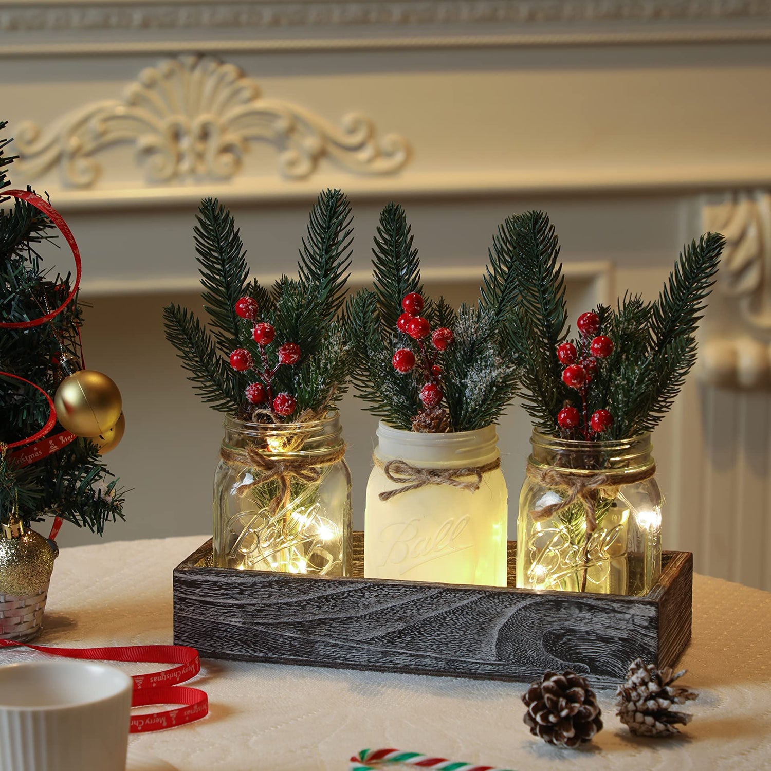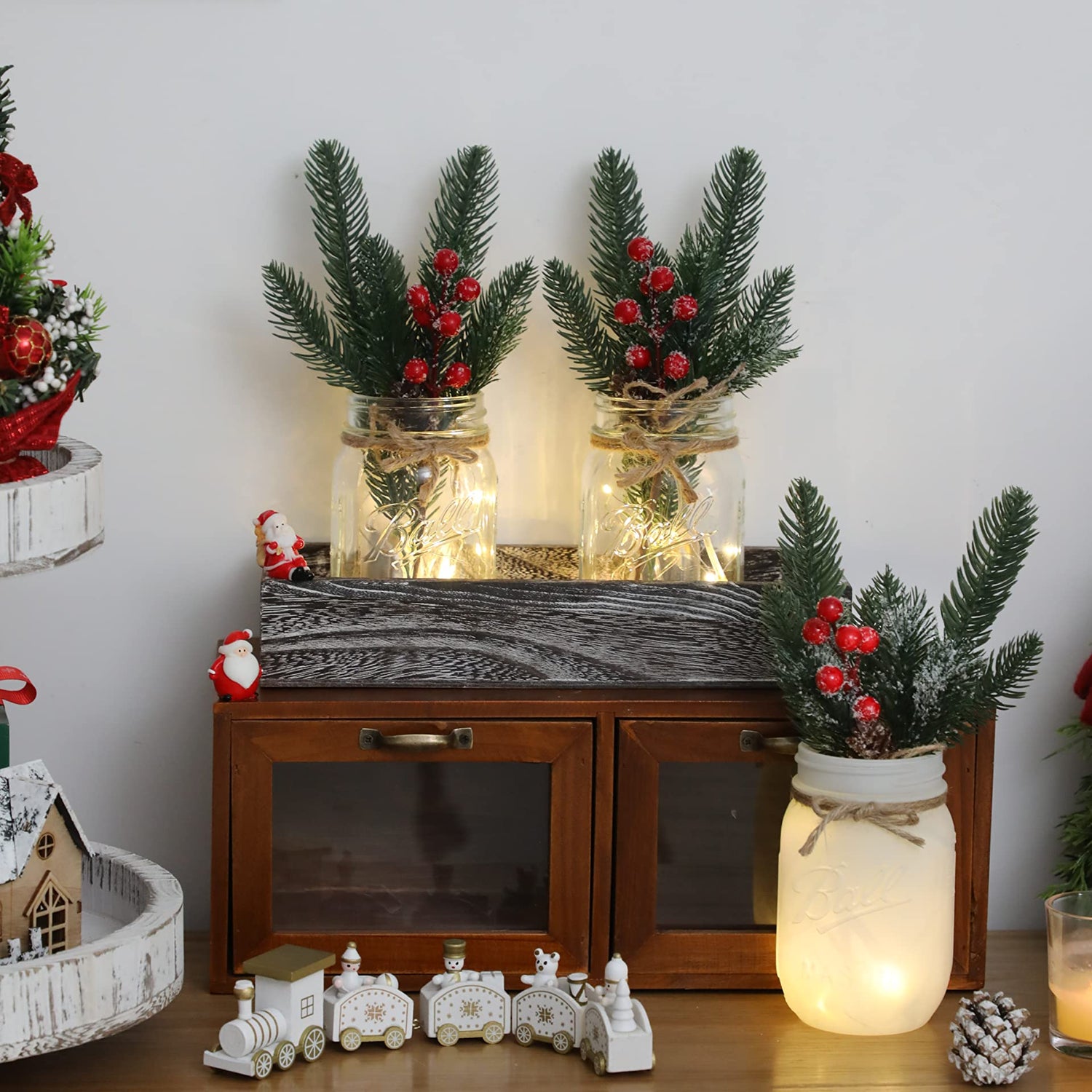 Christmas Mason Jar Centerpiece for Table with LED Lights & Artificial Plants, Set of 3 Farmhouse Decorative Mason Jars for Christmas Home Decor, Winter Kitchen Dining Table Centerpiece