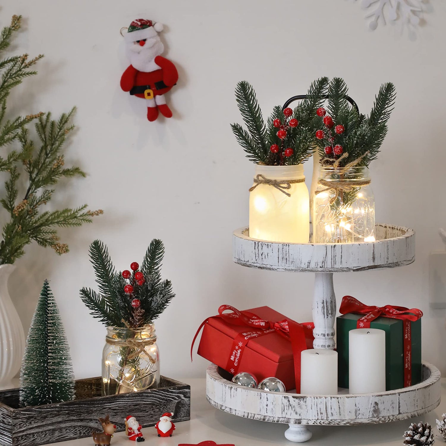 - 【Christmas Mason Jars】Three Christmas colored mason jars and three Christmas artificial flowers are packed in a wooden box to decorate your home and add a rich Christmas vibe.