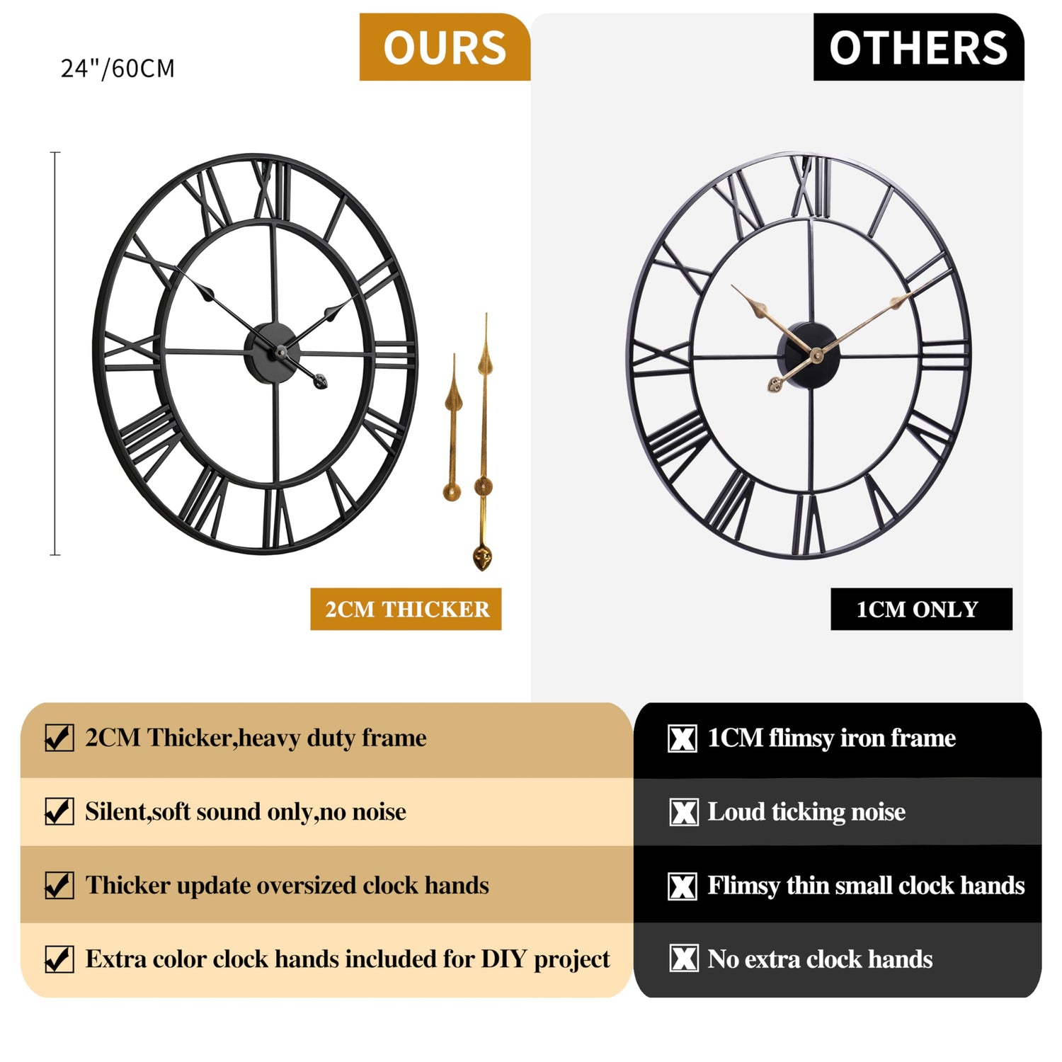 - [Easy to Read and Hang]-This large 24 Inch wall clock is simple to hang based on included round keyhole style installation on the center back;Package Comes with 1 set extra antique gold color Clock Hands+ non-traceable plastic hook , select your favorite fresh look & enjoy your DIY time