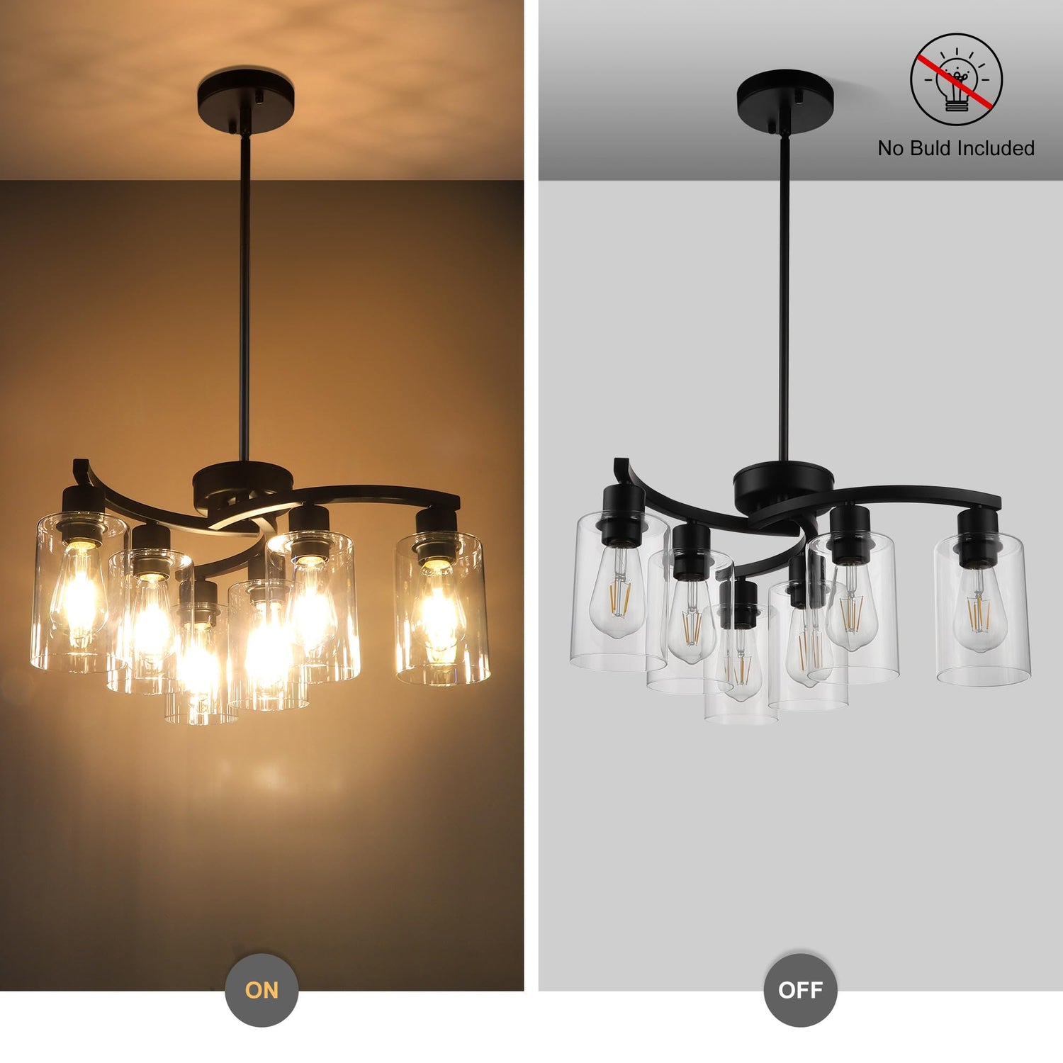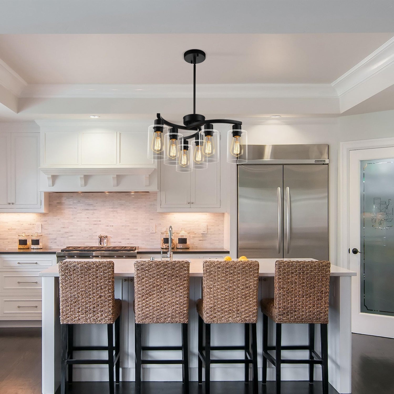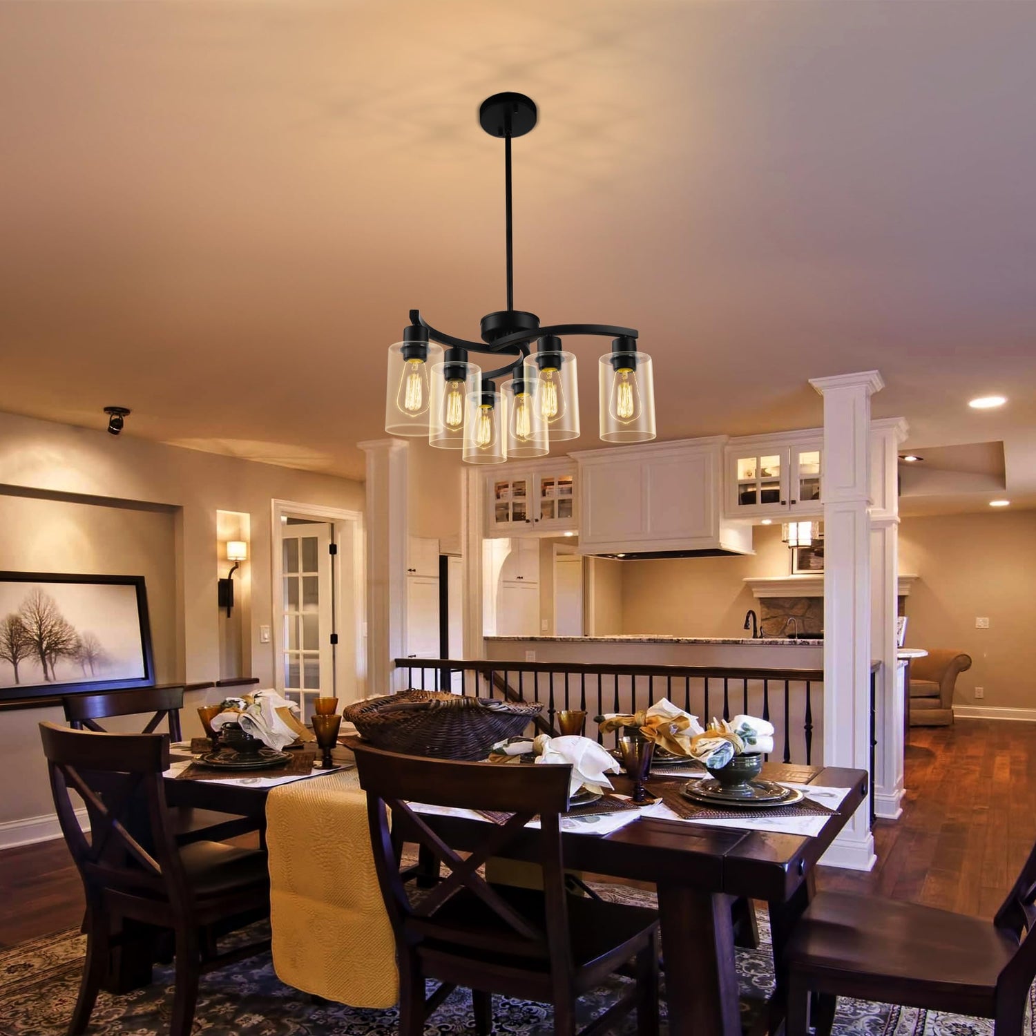 CNRATYE 6-Light Modern Farmhouse Black Chandelier, Contemporary Dining Room Light Fixture, Adjustable Height Hanging Industrial Pendant Lights Kitchen Island, Clear Glass Shade