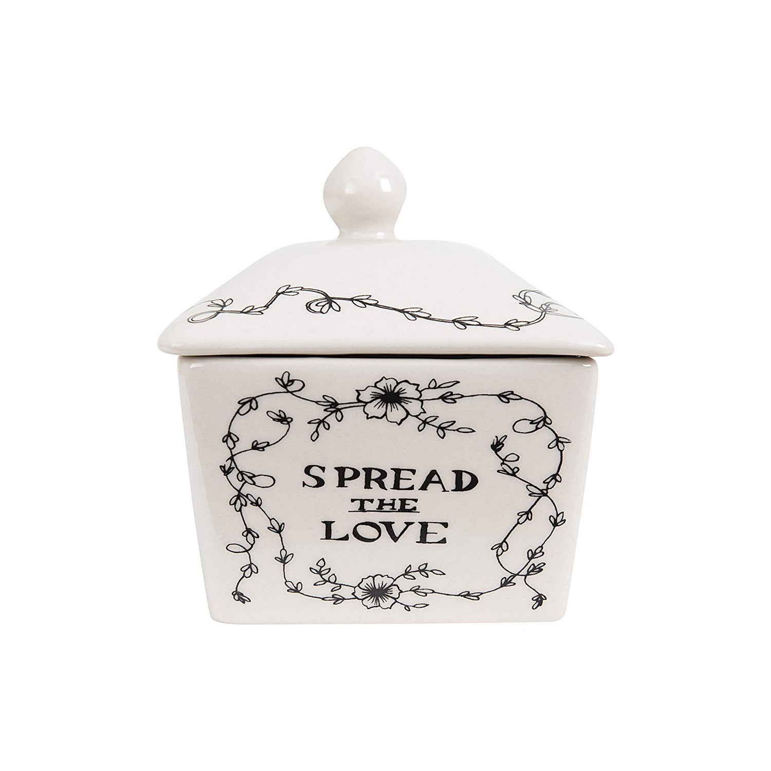 Creative Co-Op Country Stoneware Butter Dish with Lid, "Spread the Love" Message, and Farm Line Drawing, White and Black, Food, Microwave, and Dishwasher Safe