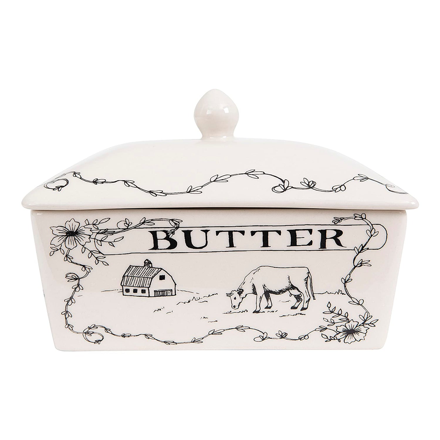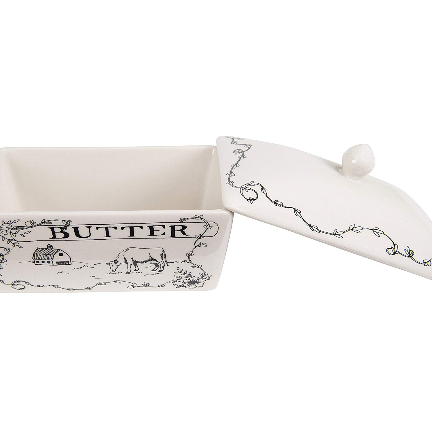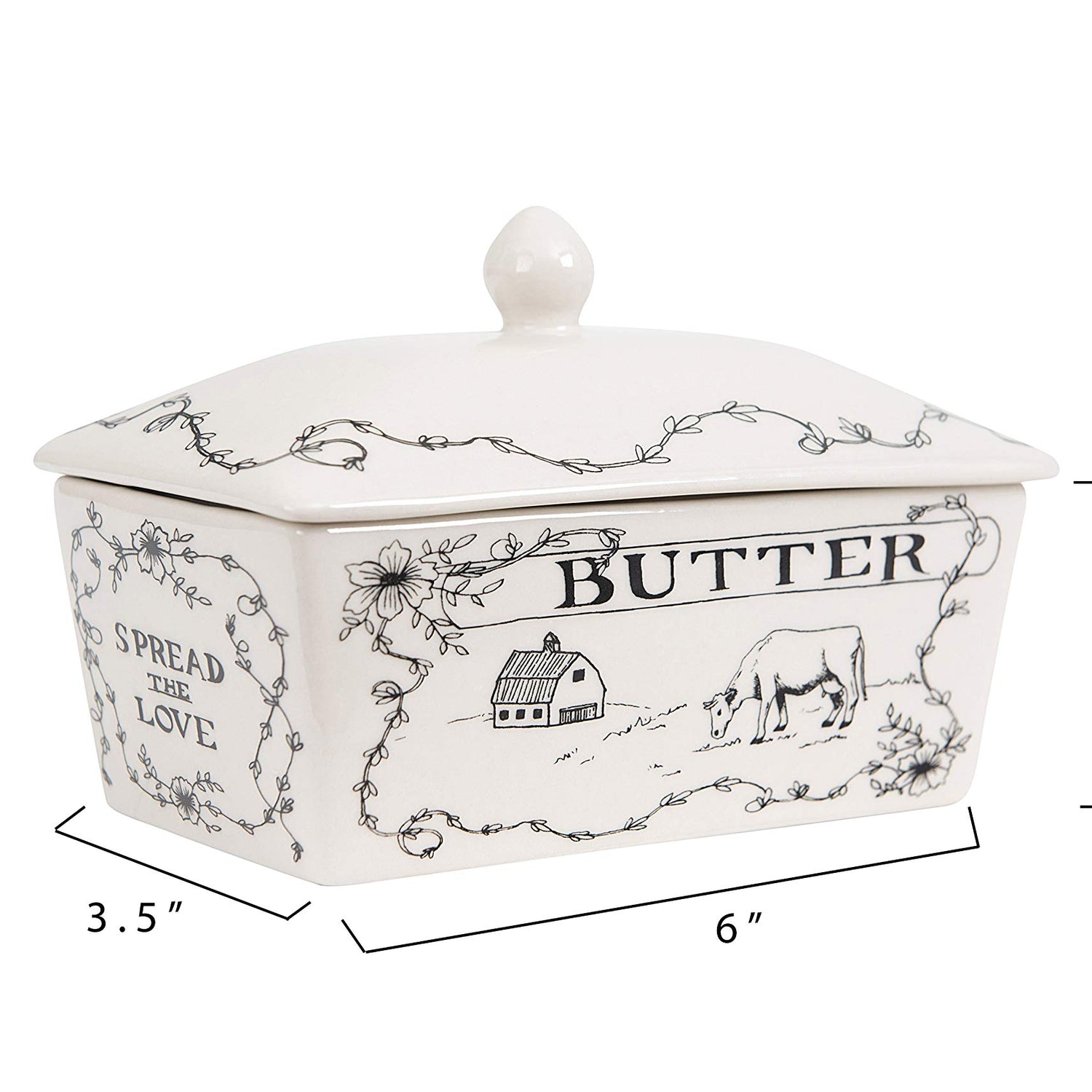 - This farmhouse-inspired butter dish features a vintage silhouette finished with intricate line drawings of a farm landscape, florals, and "spread the love" message