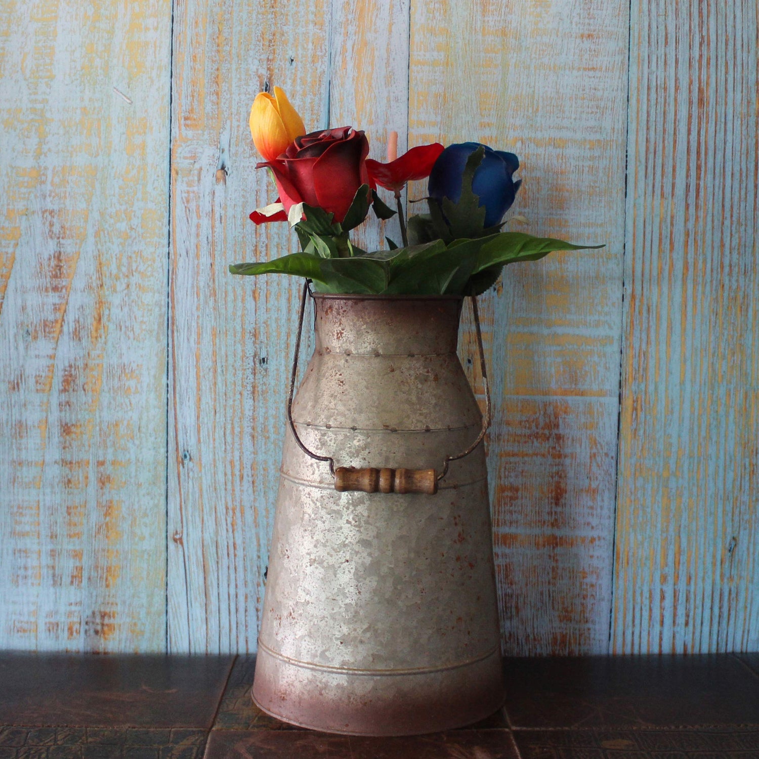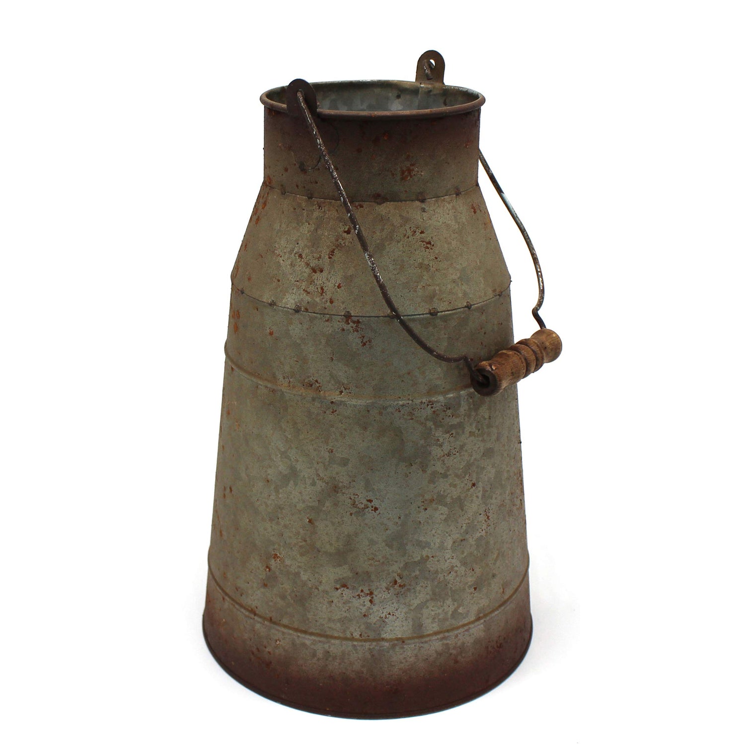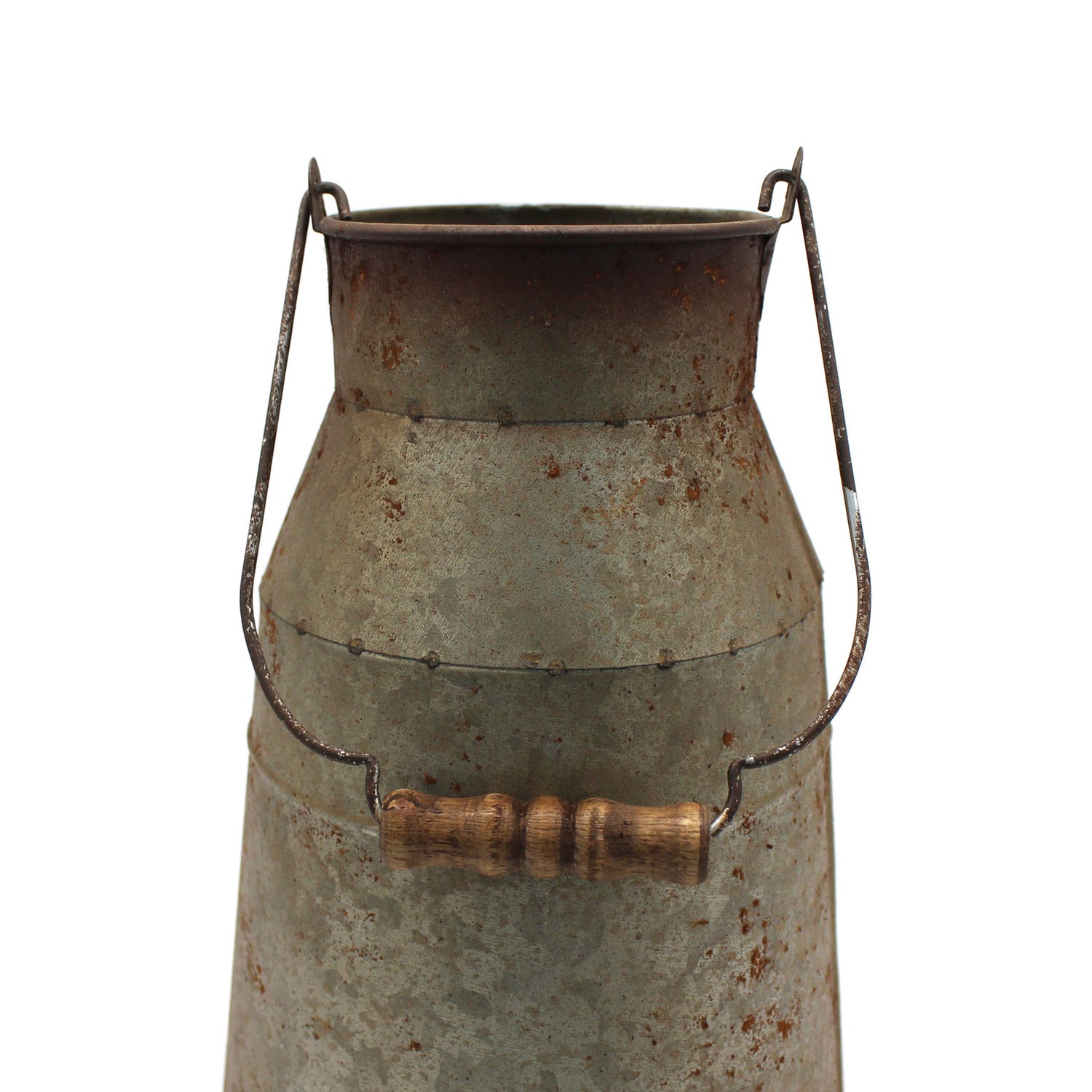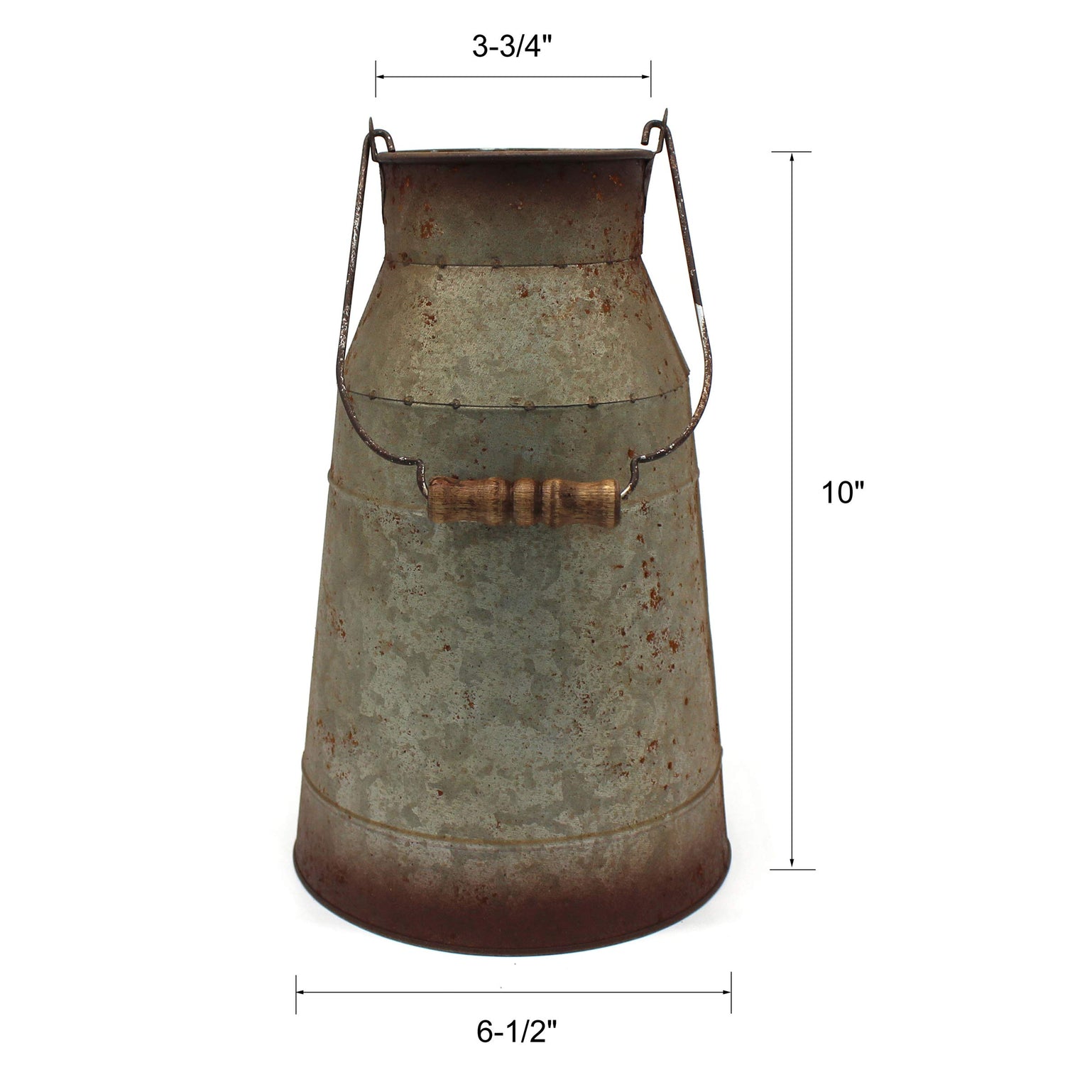 CVHOMEDECO. 10 Inch Galvanized Metal Milk Can with Wooden Handle, Old Rustic Farmhouse Pitcher Jug Vase for Home and Garden Décor. Grey