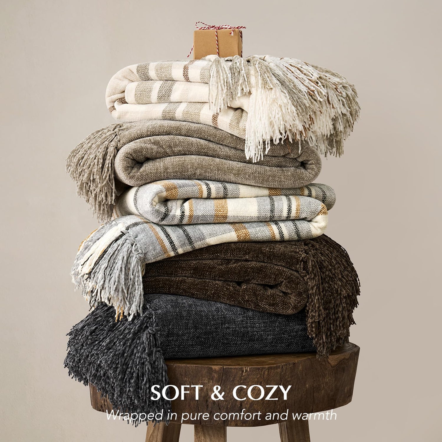 EVERGRACE Plaid Chenille Throw Blanket for Couch, Super Soft Cozy Decorative Farmhouse Plaid Throw with Tassels, Lightweight Chenille Knit Throw for Bed Sofa Gift Home Decor, Grey & Beige 50"x60"