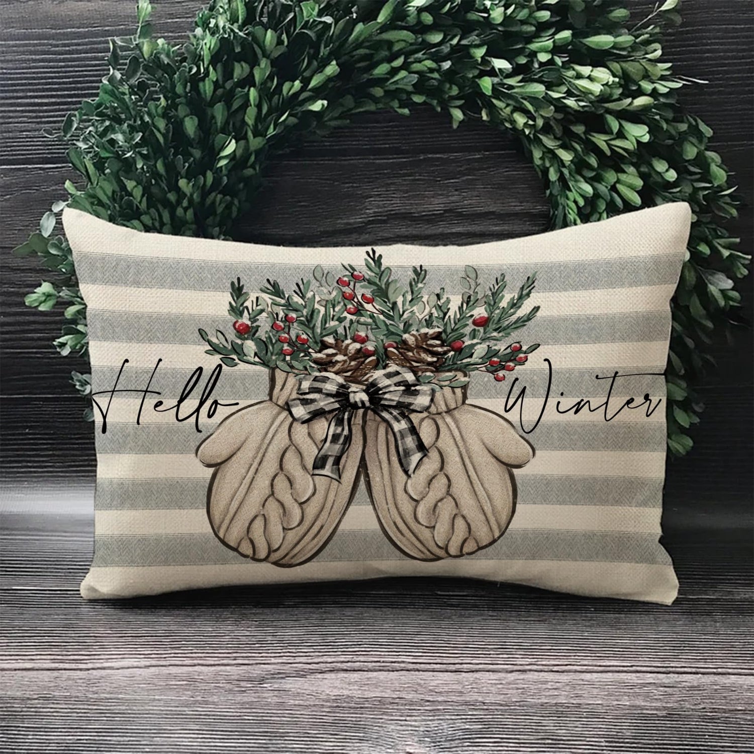 Fjfz Hello Winter Gloves Gray Lumbar Decorative Throw Pillow Cover 12 x 20, Rectangular Red Berry Gray Stripe Outdoor Home Decor, Plaid Bow Pine Cone Christmas Holiday Seasonal Farmhouse Cushion Case