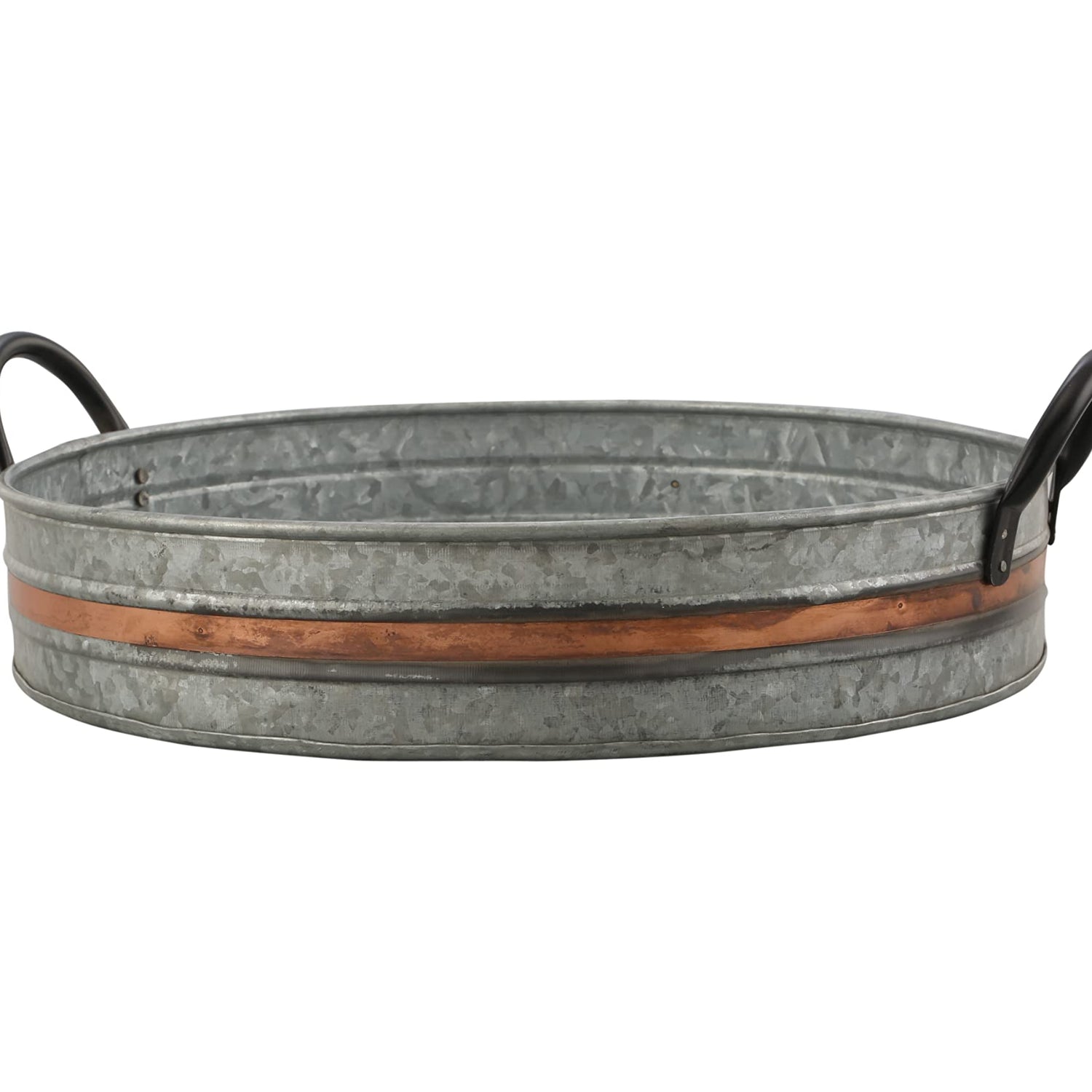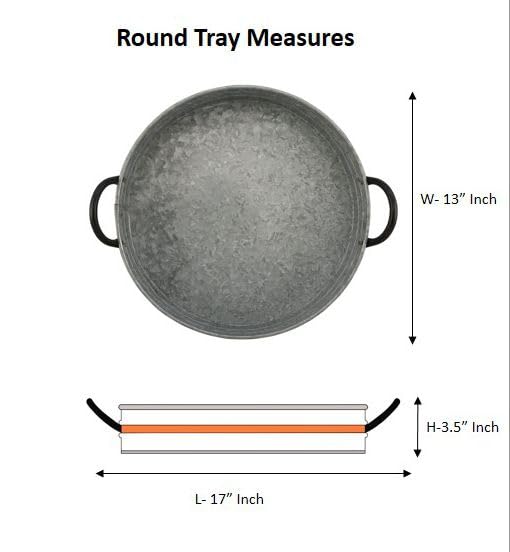 - This decorative serving tray is Round and Its overall measures is 17" x 13" x 3.5” Inches. In this tray Copper strip makes it charming to enhance the beauty of your Home & Farmhouse, also Wooden handles make it comfortable to easy carry and perfect grip.