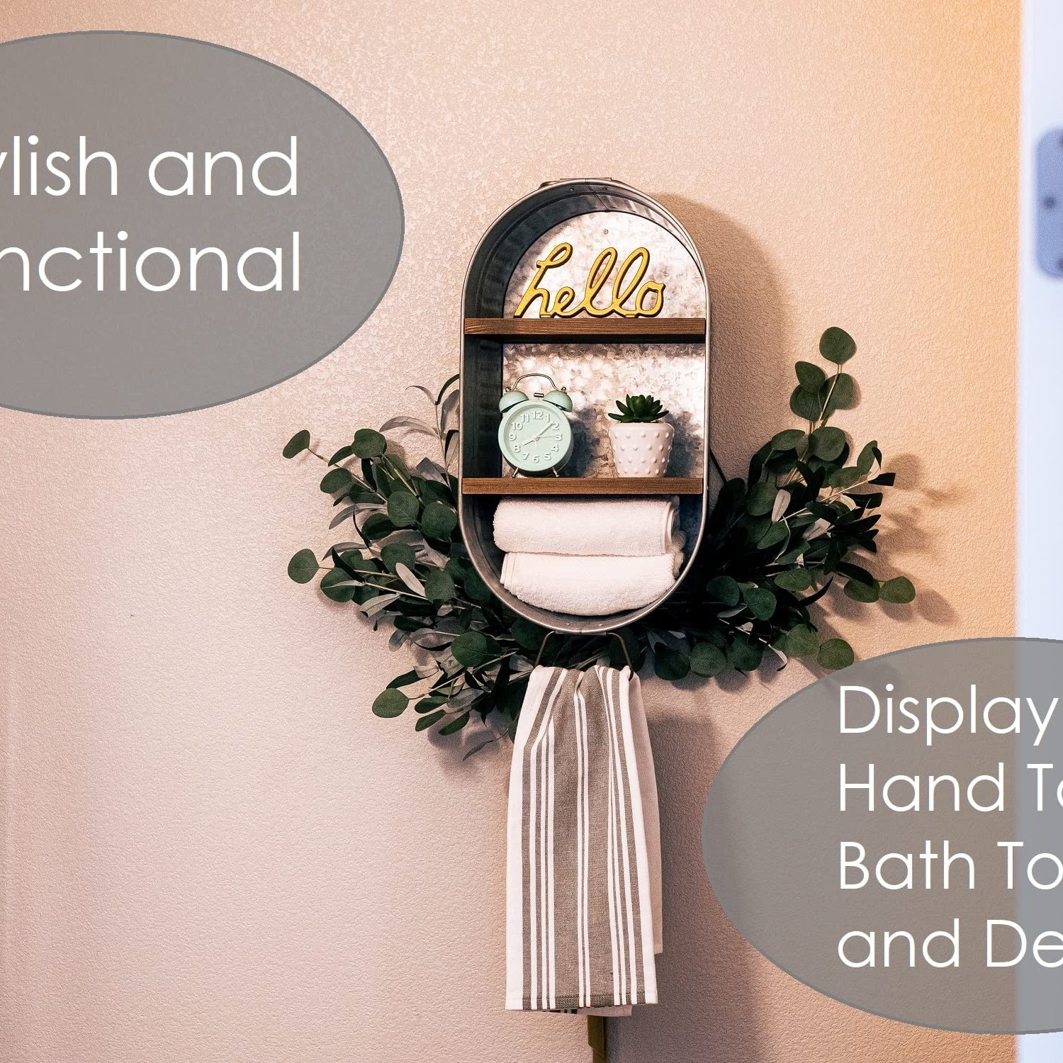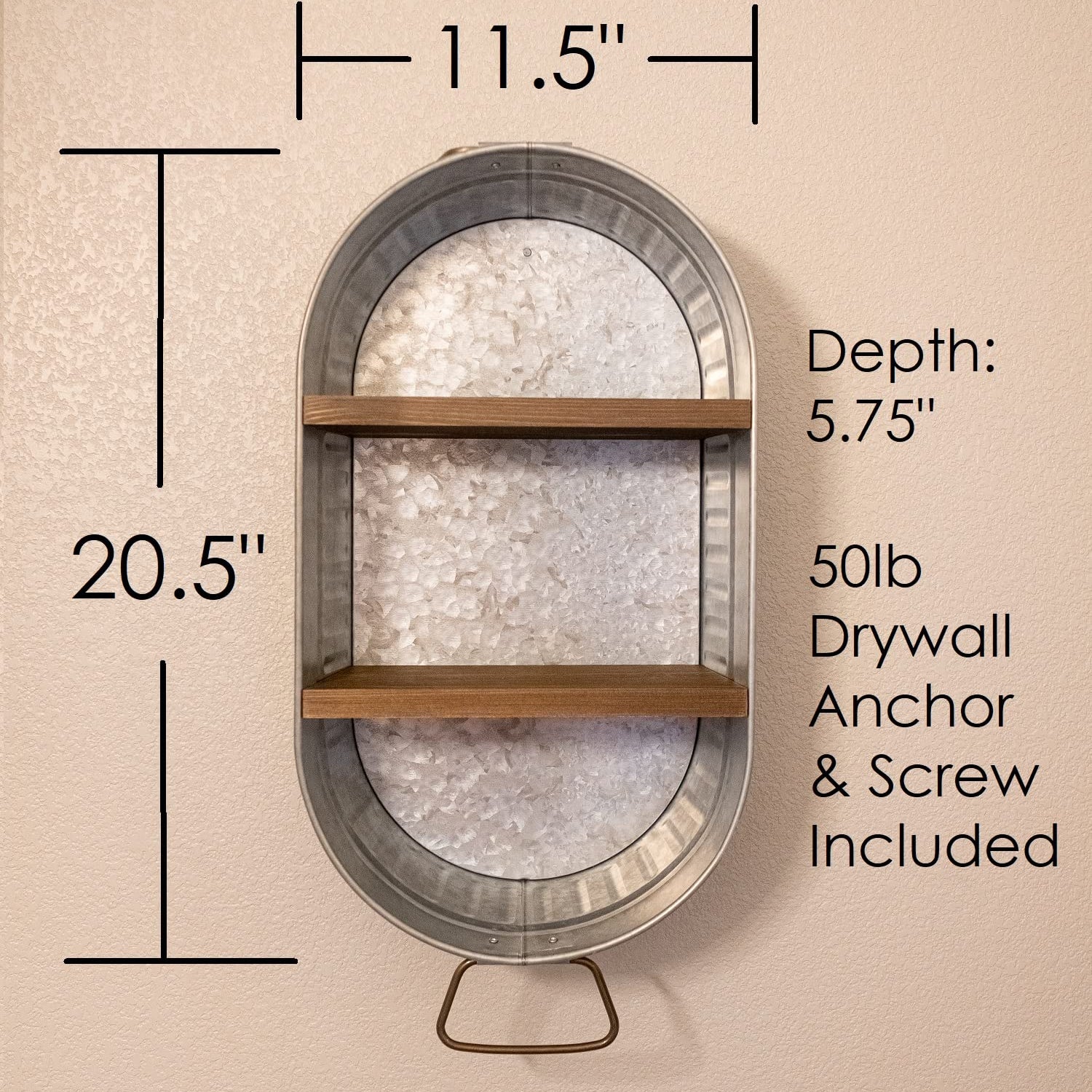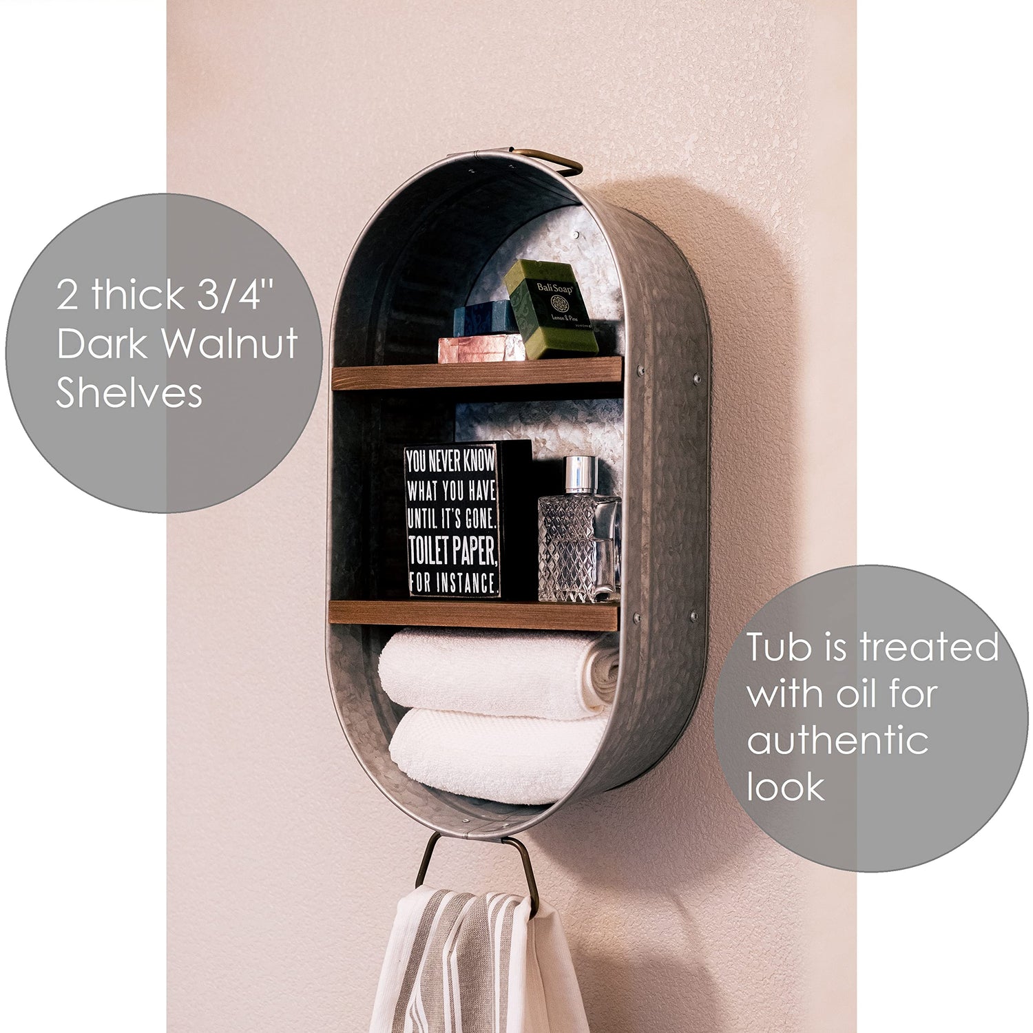 - Make a statement with this unique rustic bathroom décor! The galvanized tub comes with two dark walnut shelves with 6-inch equal spacing. Proudly made in the USA, this tub is meticulously crafted from durable galvanized steel, boasting a sleek and polished surface. Perfect for storing towels and adding wall décor for the bathroom, laundry room décor, and just about anywhere!