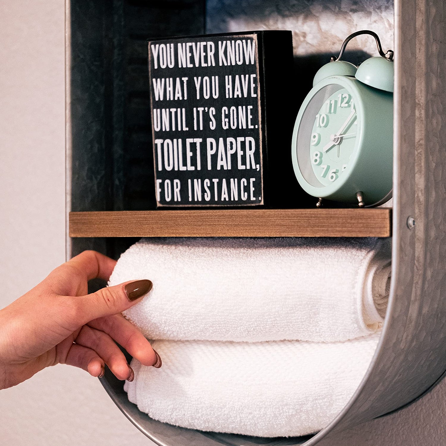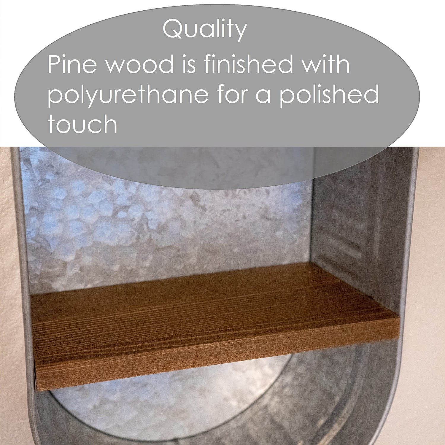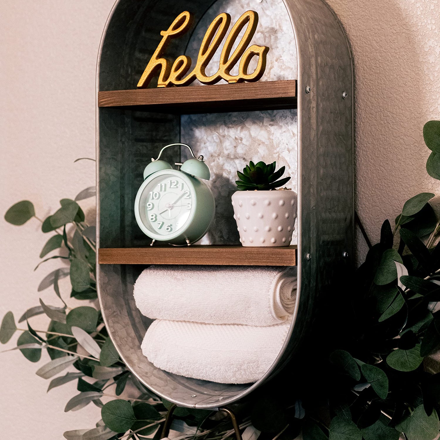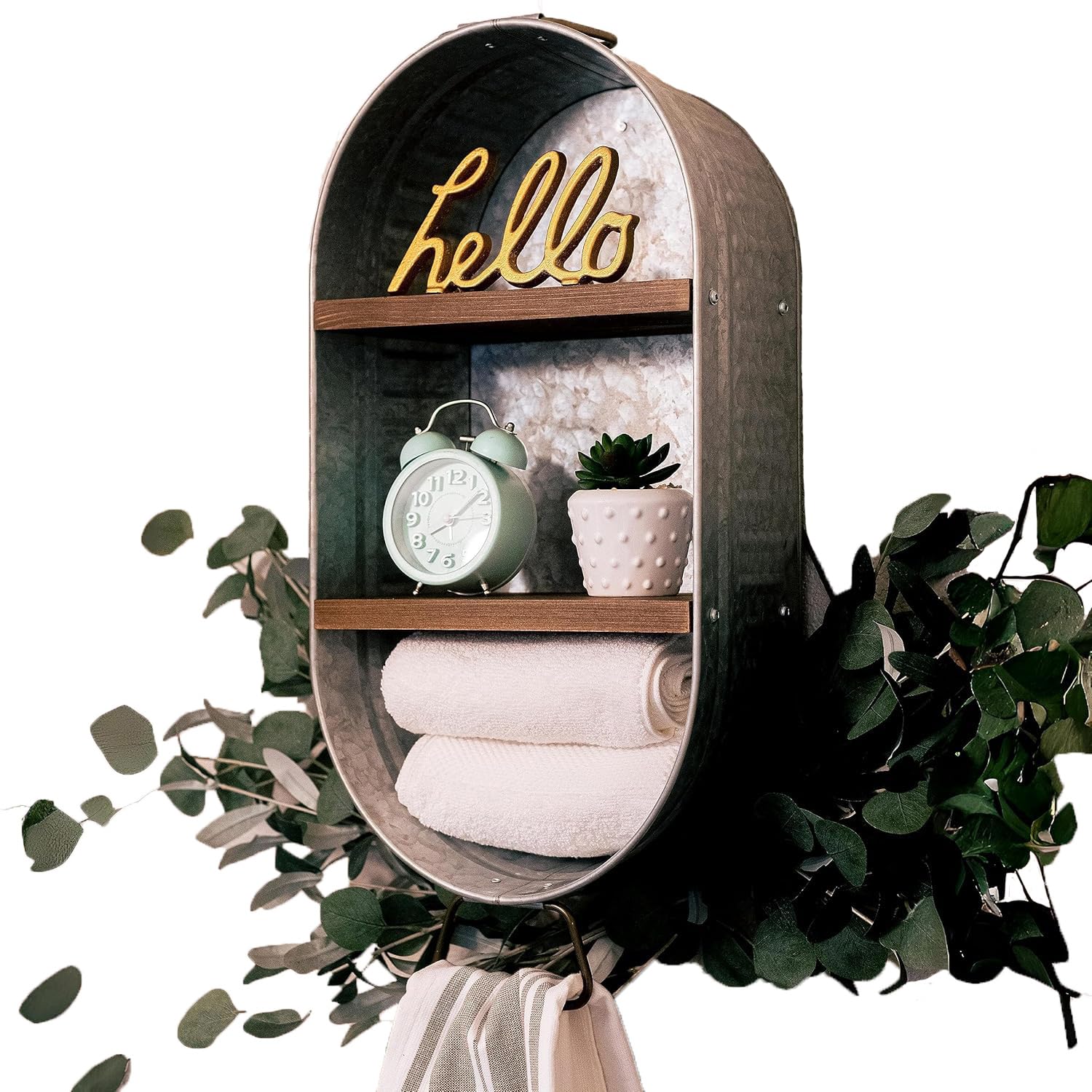 - Make a statement with this unique rustic bathroom décor! The galvanized tub comes with two dark walnut shelves with 6-inch equal spacing. Proudly made in the USA, this tub is meticulously crafted from durable galvanized steel, boasting a sleek and polished surface. Perfect for storing towels and adding wall décor for the bathroom, laundry room décor, and just about anywhere!