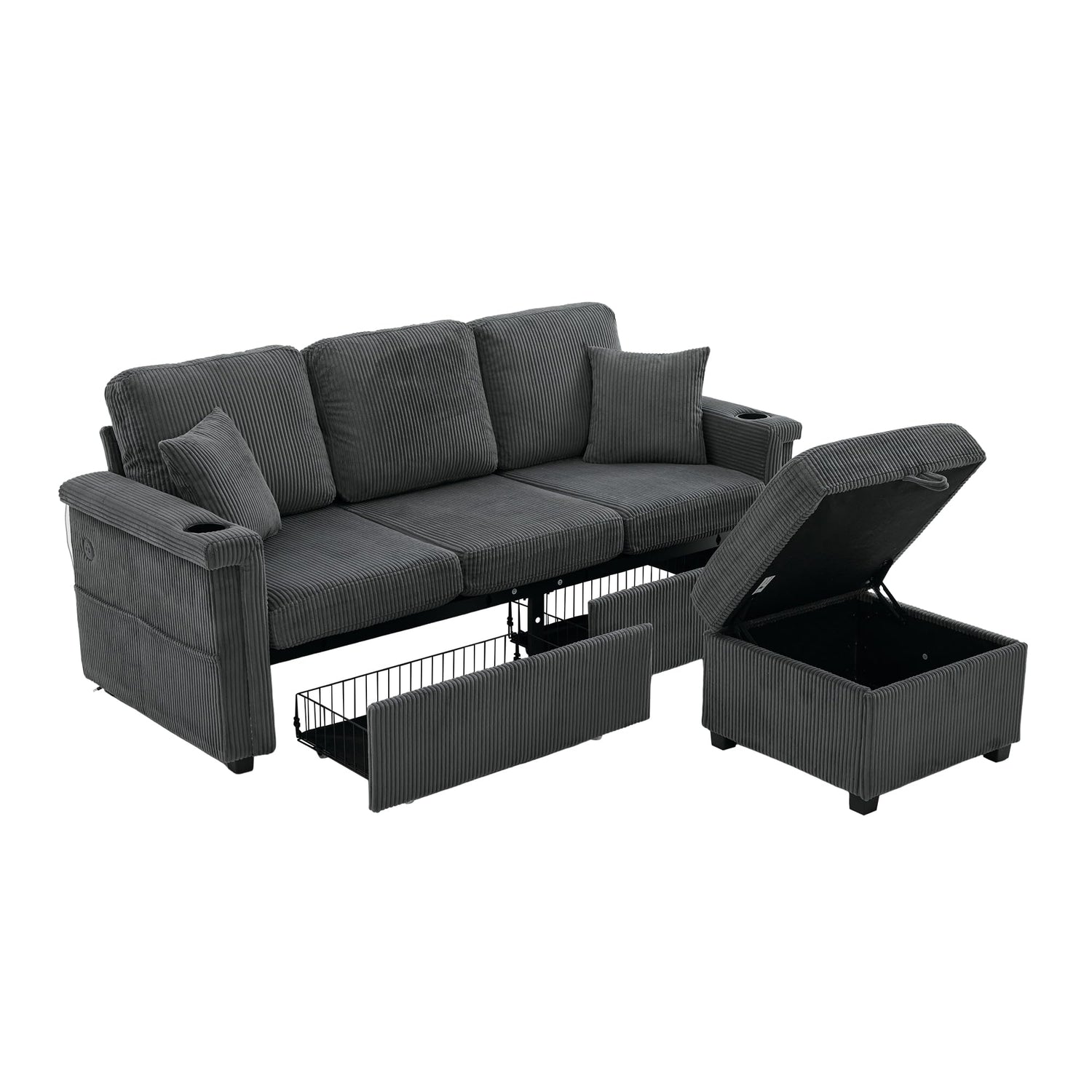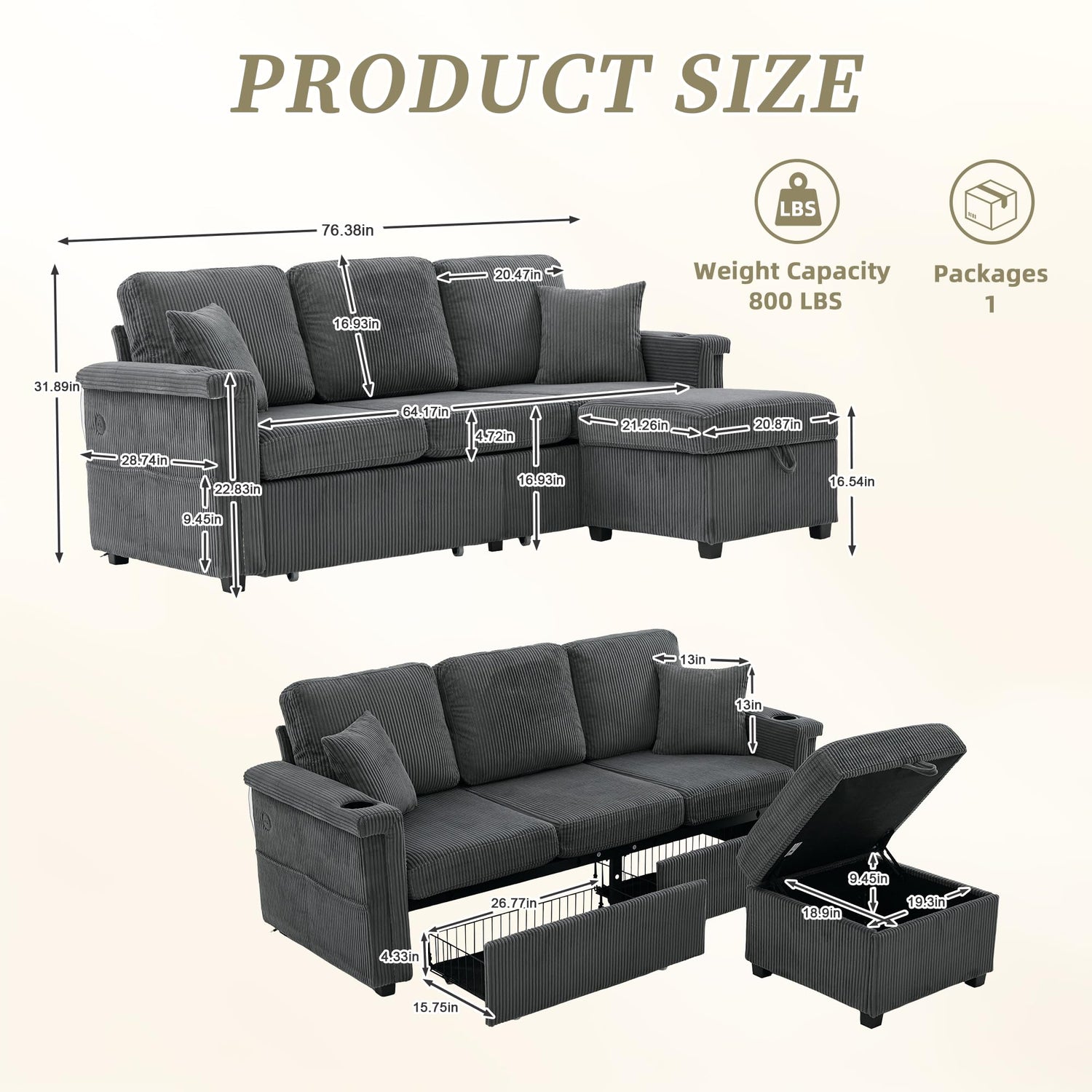 GDFStudio Modern L-Shaped Sectional Sofa with Pull-Out Storage, Ottoman, USB Charging & LED Lights, Cup Holders, Convertible 3-Seater Corduroy Upholstered Couch for Living Room, Apartment, Dark Gray