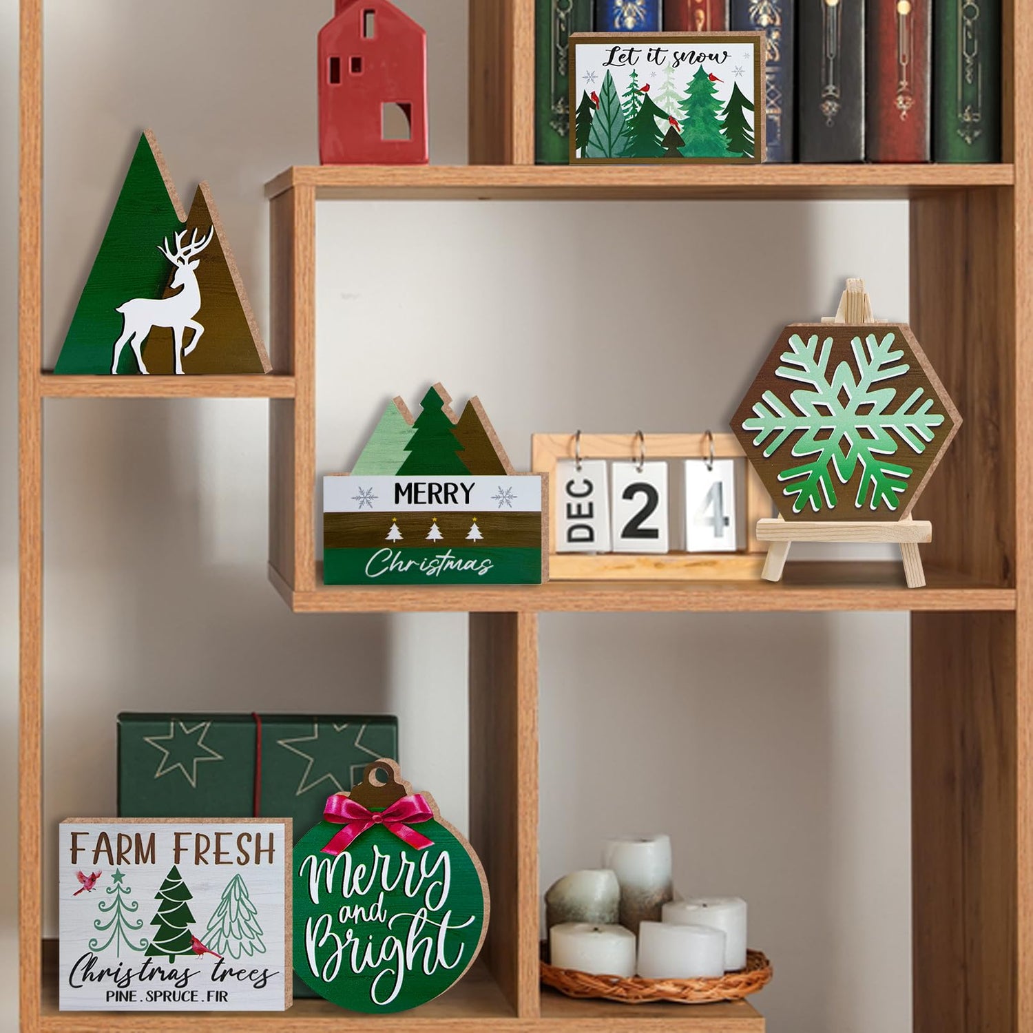 Guoofu 11 Pcs Merry Christmas Green Tiered Tray Decor, Farm Fresh Xmas Tree Balls Reindeer Snowflake Farmhouse Wood Decorations Set, Winter Holiday Rustic Wooden Decorative Signs for Home Table Shelf