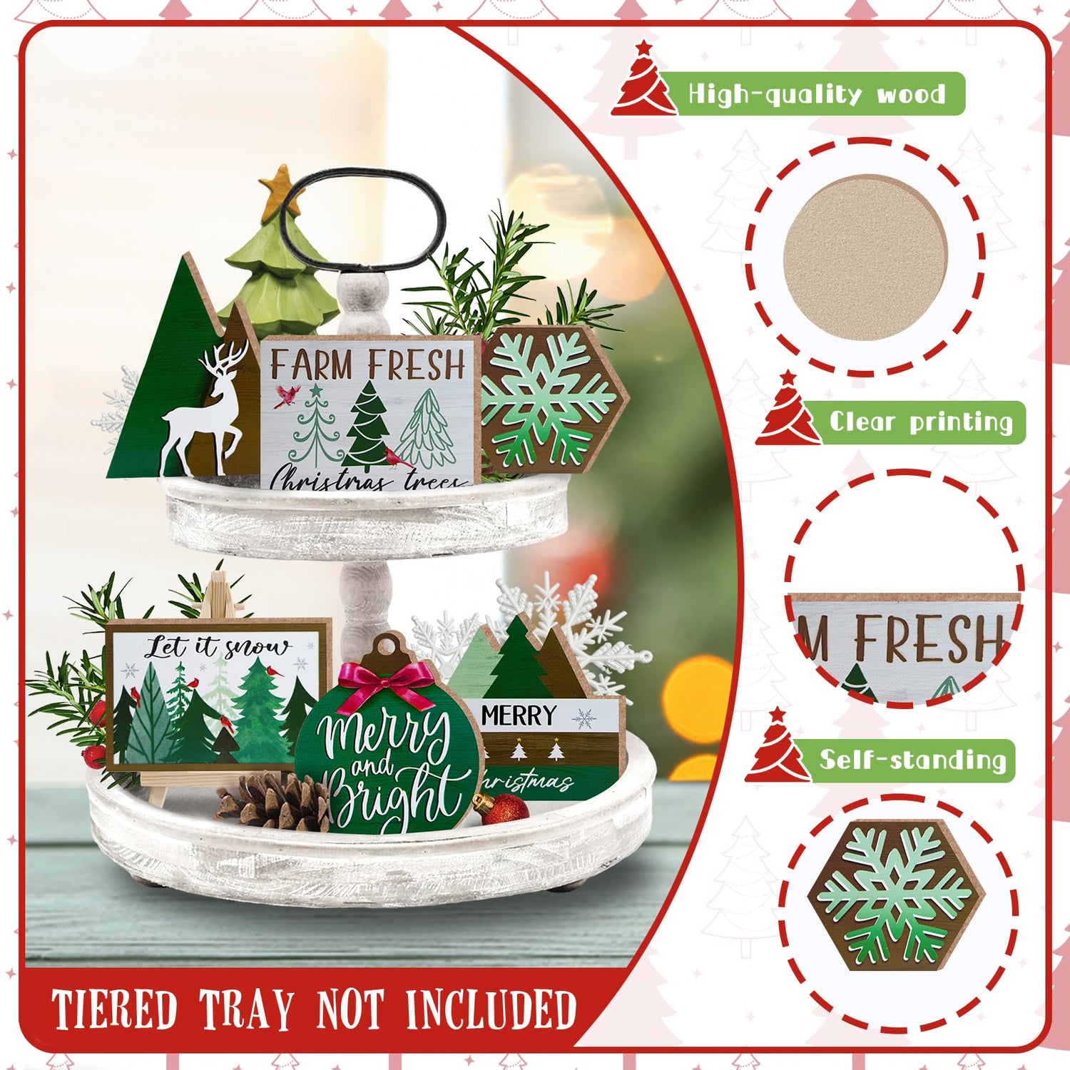 - Package Including: 11 Pcs tiered tray decorations set is a perfect addition to your home decoration. You will get 1 x "merry and Bright" sign, 1 x "FARM FRESH Christmas trees" sign, 1 x pine tree reindeer sign, 1 x "MERRY Christmas" sign, 1 x snowflake sign, 1 x "Let it snow" sign, 3 x snowflakes decors, 1 x pine cone decor and 1 x wooden tripod. With these tiered tray decor, you can have a nice time with your family in Christmas. Please note that tiered tray is not included