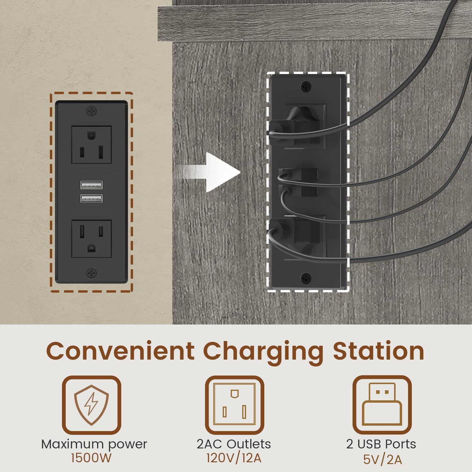 HAUOMS Farmhouse Executive Desk with Drawers Computer Desk with File Drawers, Power Outlet and Led Lights, Executive Office Desk with Storage Cabinet and Monitor Shelf for Home Office, Grey