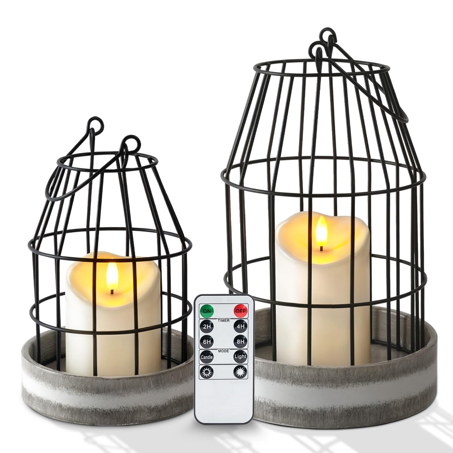 Homemory Rustic Farmhouse Lantern Decor with Flameless Candle & Remote Timer, 2PCS Metal Candle Holder Home Decorations for Fireplace Mantle Kitchen Dining Table Living Room