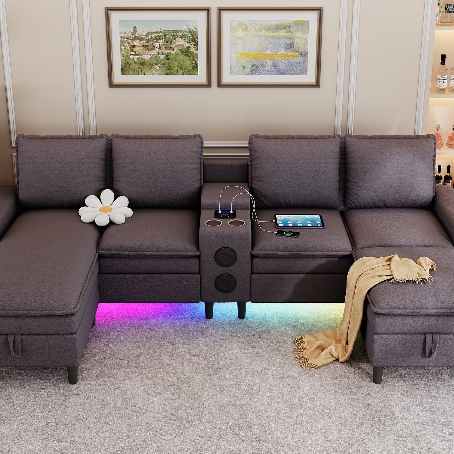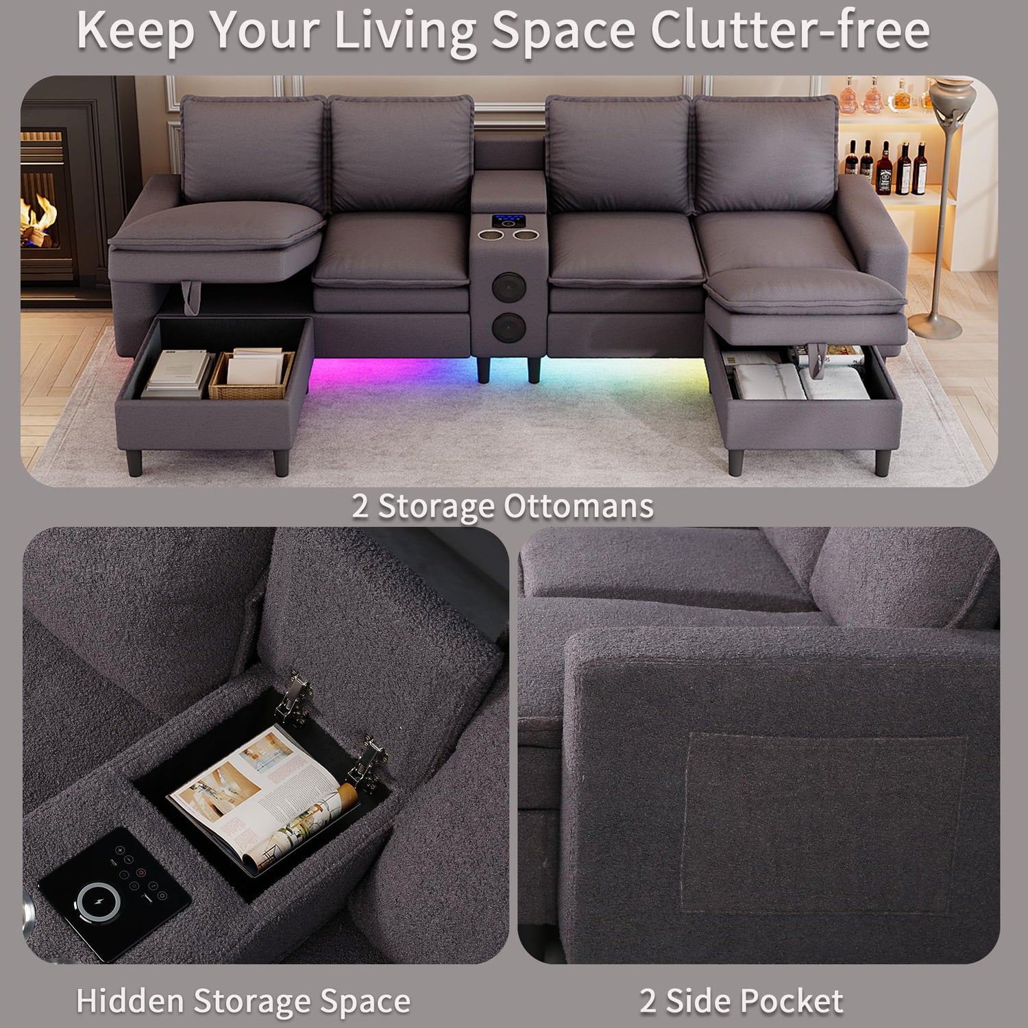 HYZQ Sectional Couches for Living Room, 4 Seat Sectional Sofa with Smart Module-Bluetooth Speaker/RGB Light/Charging Station, Teddy Fleece U Shaped Cloud Couch with Storage Ottoman (Dark Grey)