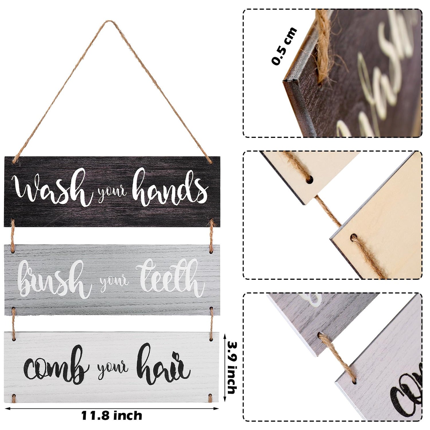 - Package content: the wood hanging wall signs consist of 3 classic colored wooden boards tightly strung by a rope, and the board is printed with funny bathroom words, adding more artists to your home