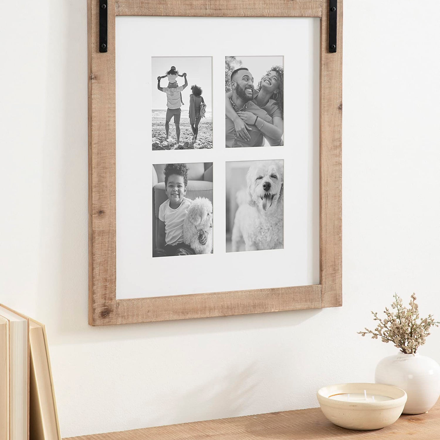 Details: Craft a memorable farmhouse display with this charming Cates photo collage frame. With four spaces for 5x7 photographs, the Cates picture frame allows you to create a lovely collage of summer vacation pictures, school photos, or childhood memories. Molded after the Cates mirror and wall organization collections, this picture frame features the same barn door-inspired design with the metal detailing above the frame and its overall rustic charm. This is a lovely way to showcase your memories while complementing your modern farmhouse decor style. Perfect on its own or in multiples, the Cates photo collage flows perfectly throughout your home. It is a lovely decorative way to include your favorite photographs in your living room, bedroom, bathroom, entryway, and anywhere else in your home. The overall dimensions of the frame including the metal hardware are 21 inches wide by 25.75 inches tall. The mat dimensions are 16 inches wide by 20 inches tall with four openings for 5x7 photos. The Cates wood picture frame comes with pre-drilled holes, which make the hanging process simple and quick.