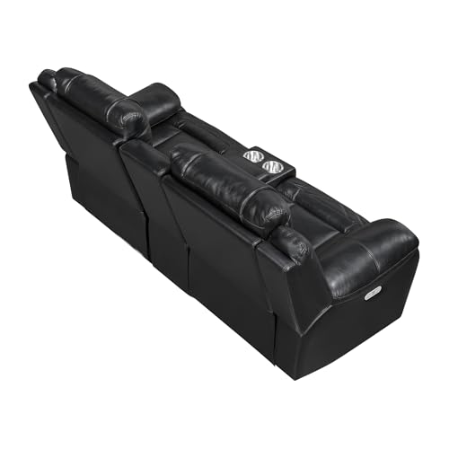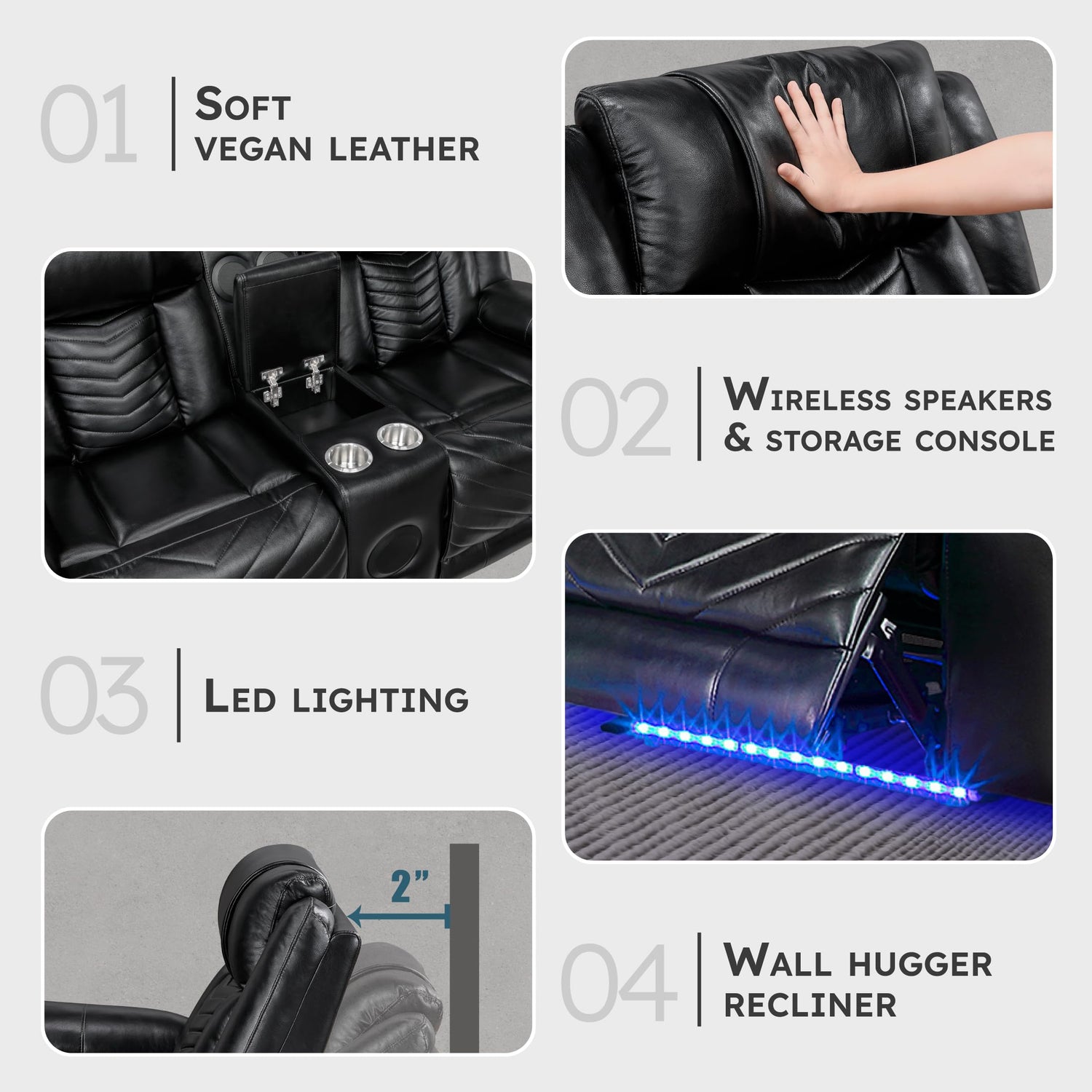 Lexicon Wall Hugger Power Double Reclining Loveseat with Console, Faux Leather Home Theater Seating with LED Lighting, Charging Ports, Bluetooth Speaker Wireless, Cup Holders, Hidden Storage, Black