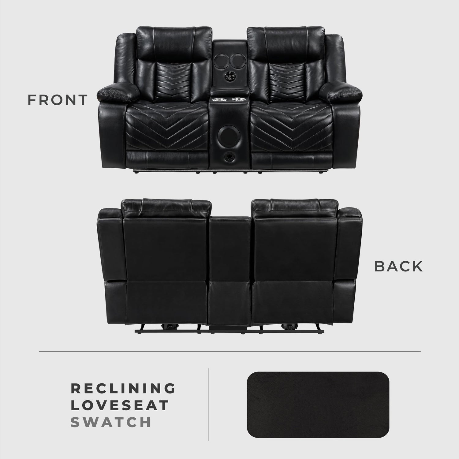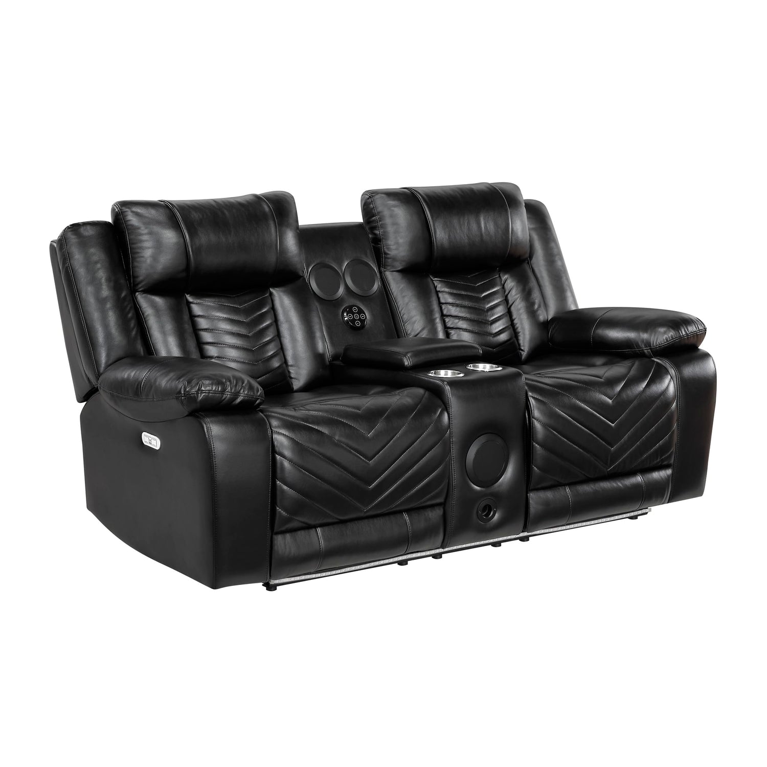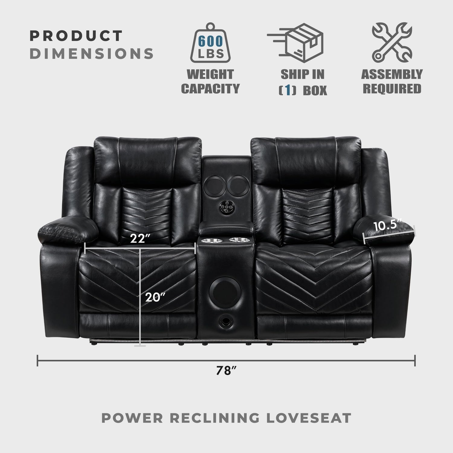 Details: Immerse yourself in the ultimate relaxation experience with our cutting-edge reclining loveseat, designed to be the centerpiece of your entertainment haven. Crafted with a robust solid wood frame and enveloped in supple, premium faux leather, this loveseat offers both durability and luxurious style. Sink into the plush foam padding over pocket coils, while the sleek V-pattern stitching adds a touch of modern sophistication. Effortlessly find your perfect position with one-touch power controls, and enjoy the convenience of a center console that boasts dual cup holders, hidden storage, and built-in wireless speakers for immersive sound. Stay connected with integrated USB charging ports, ensuring your devices are always ready, as you unwind in unparalleled comfort and style.
