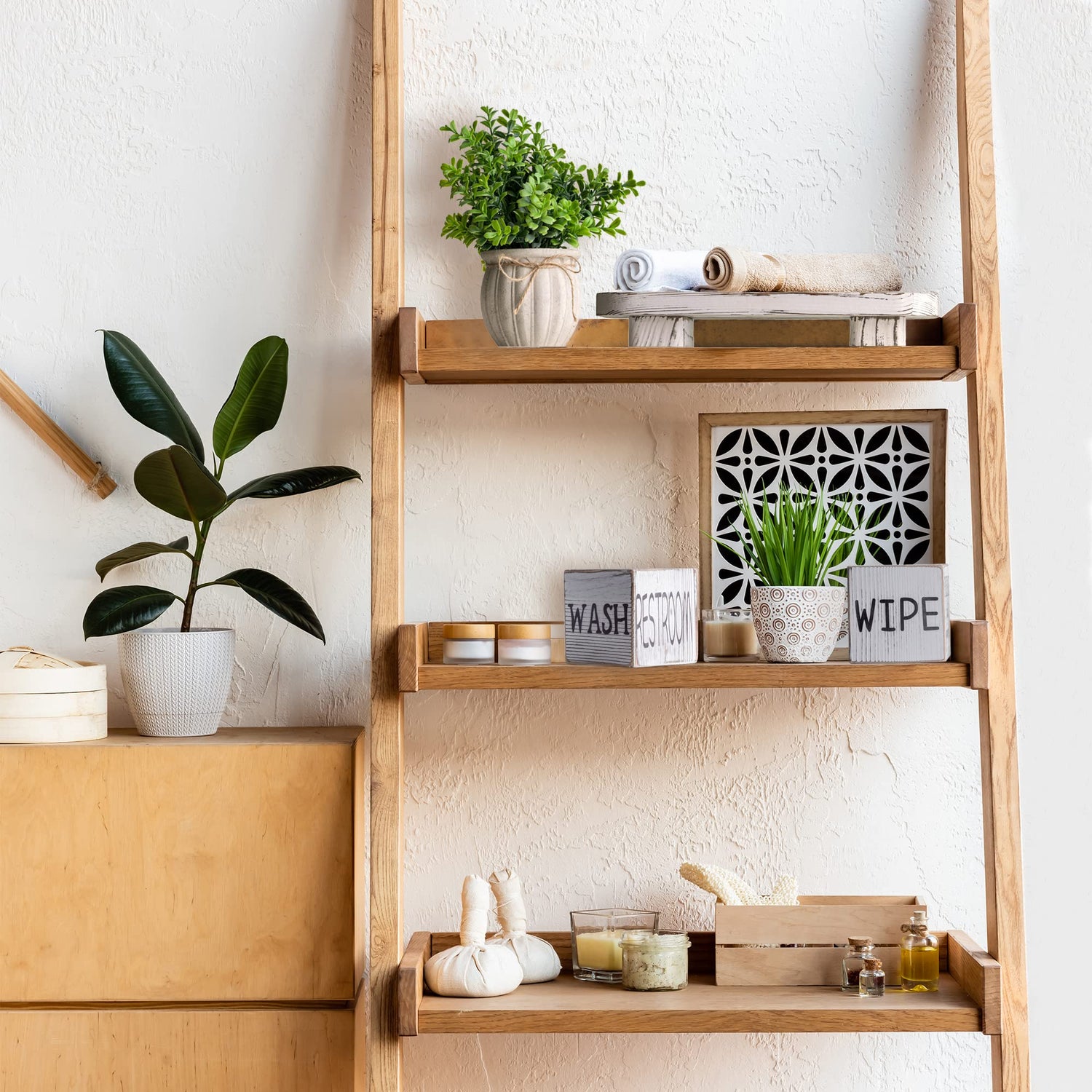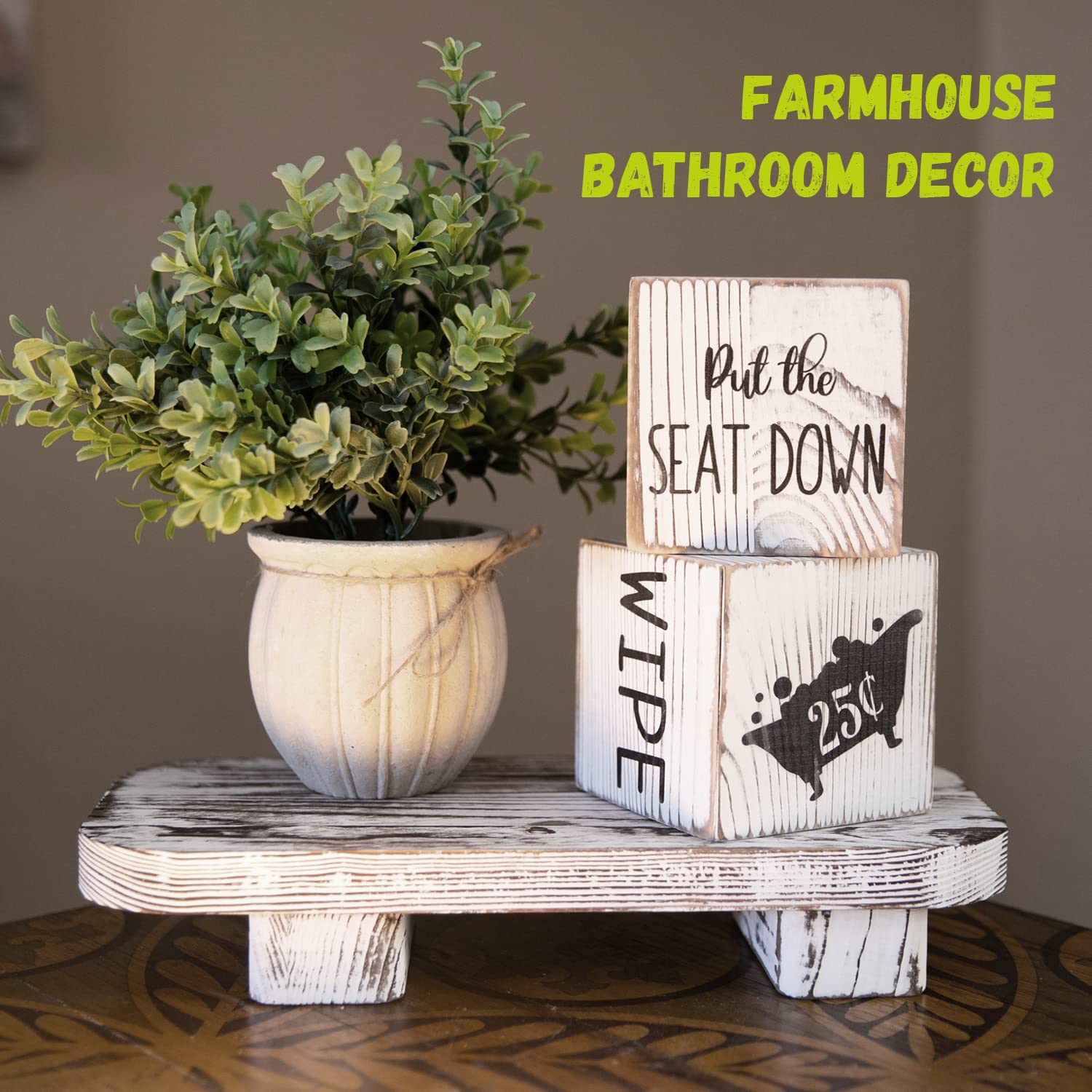 - FARMHOUSE BATHROOM DECORS: the wooden cute bathroom sign decor can go well with your all kinds of decors and the furniture in the bathroom. The simple and unique design is easily fit in with farmhouse, rustic and modern styles. The life-like potted plant makes a plus too. And the bathroom decor can be placed on the wood riser.