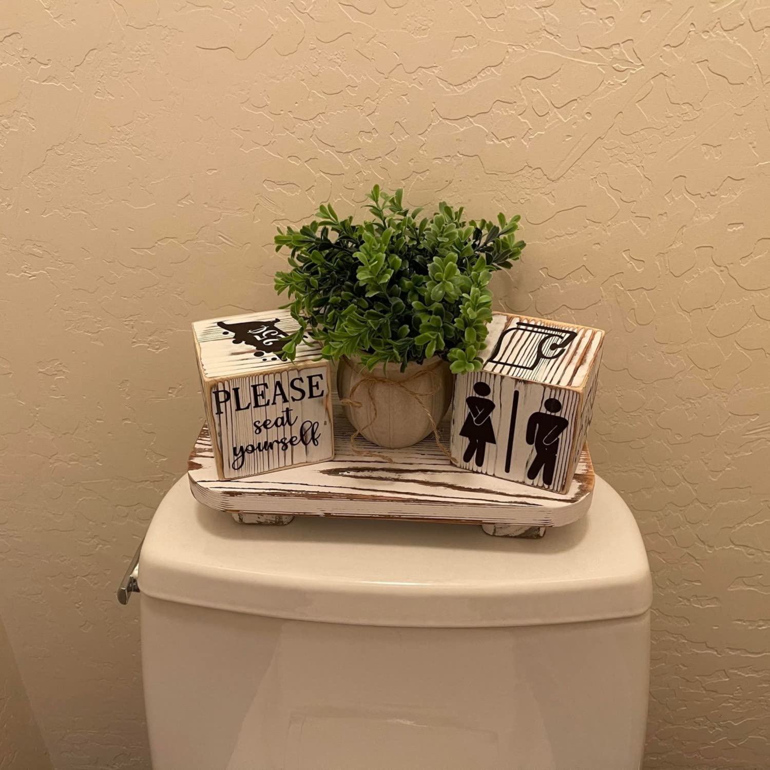 - PERFECT DECORATIVE ADDITION: The cute and naughty bathroom blocks with plant and wooden tray will add a nice touch to your guest bathroom decors. The cubes are just adorable, perfect for your half bathroom, restroom, guest bathroom, toilet, washroom, toilet tank, bathroom table, countertop, and floating shelves, etc.