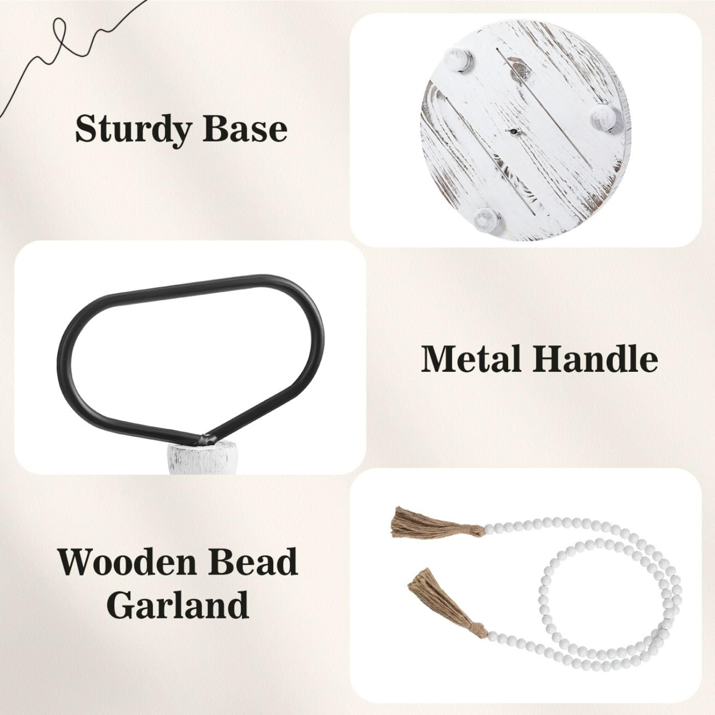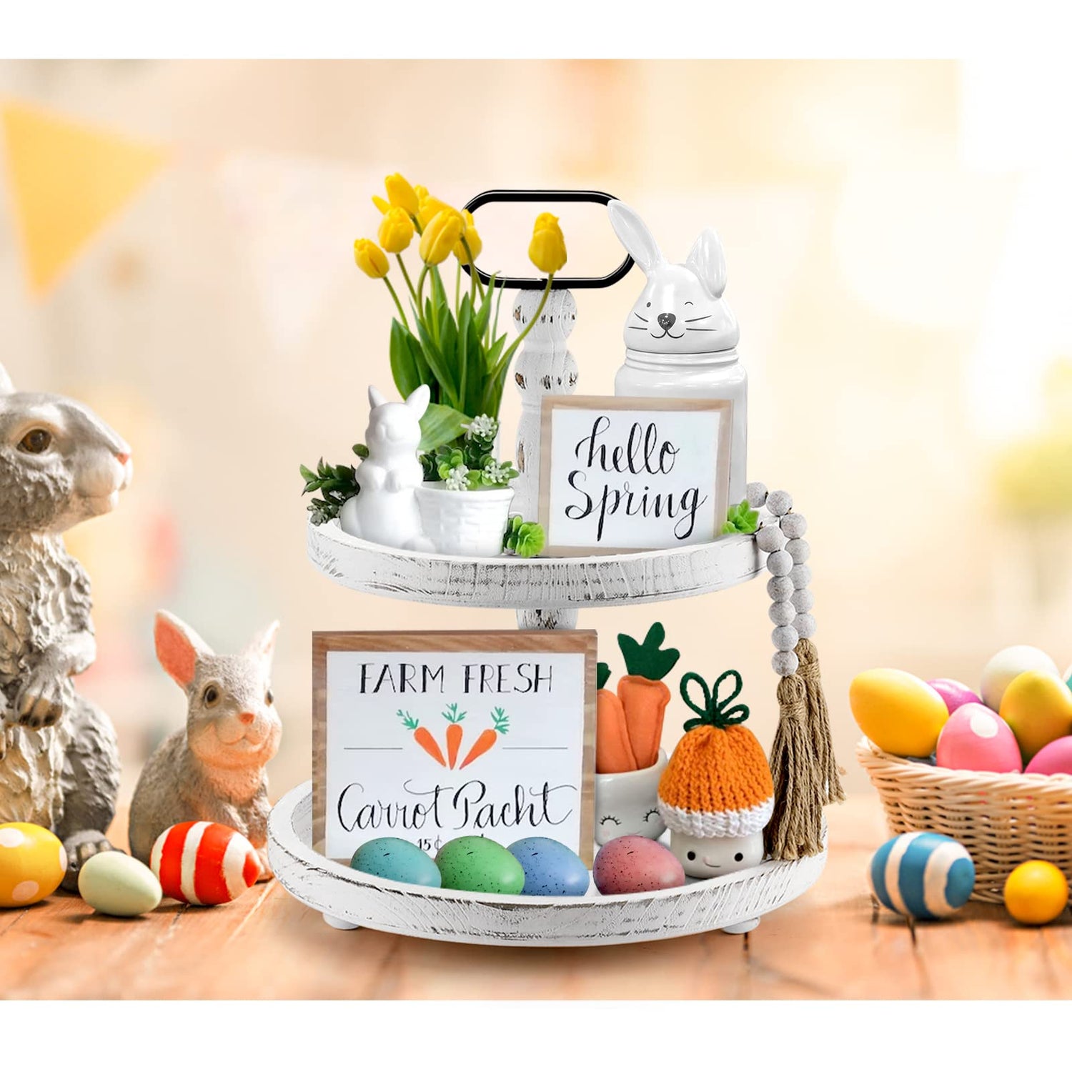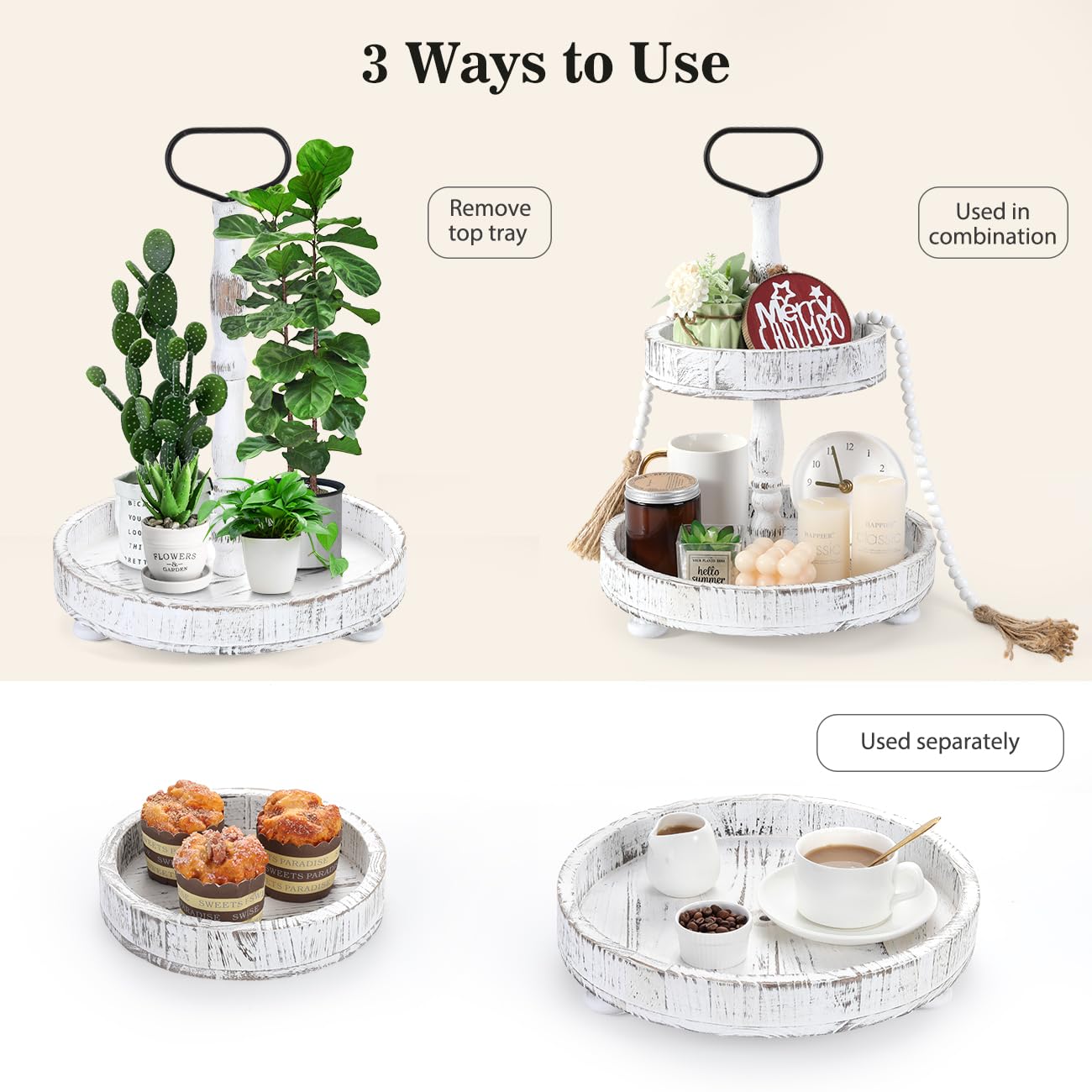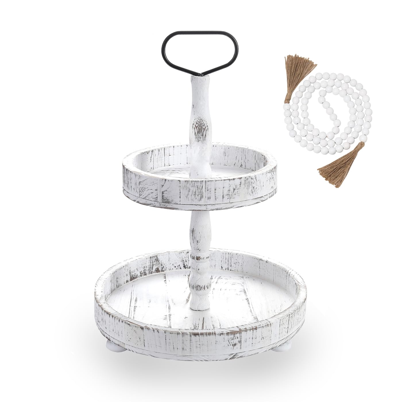 - Farmhouse 2 Tiered Tray: This wooden tiered tray comes with a delicate wooden bead garland for decoration, adding an touch of elegant to your home decor. The 2-tier tray features a sturdy metal handle for easy and safe movement.