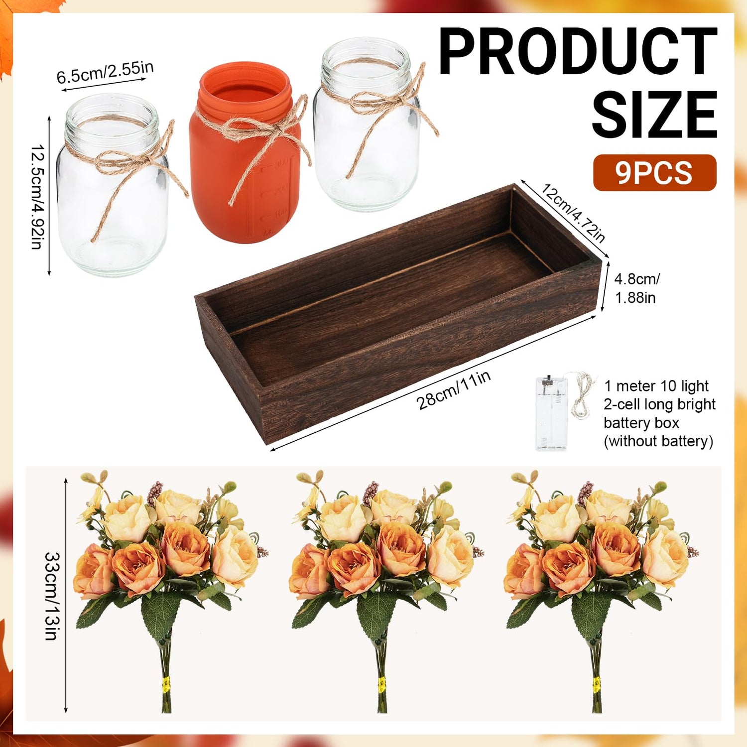 - Complete Fall Table Centerpiece Set: Includes 3 mason jars (2 clear and 1 orange), with rustic hemp rope bows, 3 bundles of artificial roses (11 inch high, 6 flowers per bundle), 2 warm white 40 inch string lights, and a sturdy wooden tray—everything you need for a charming fall display.