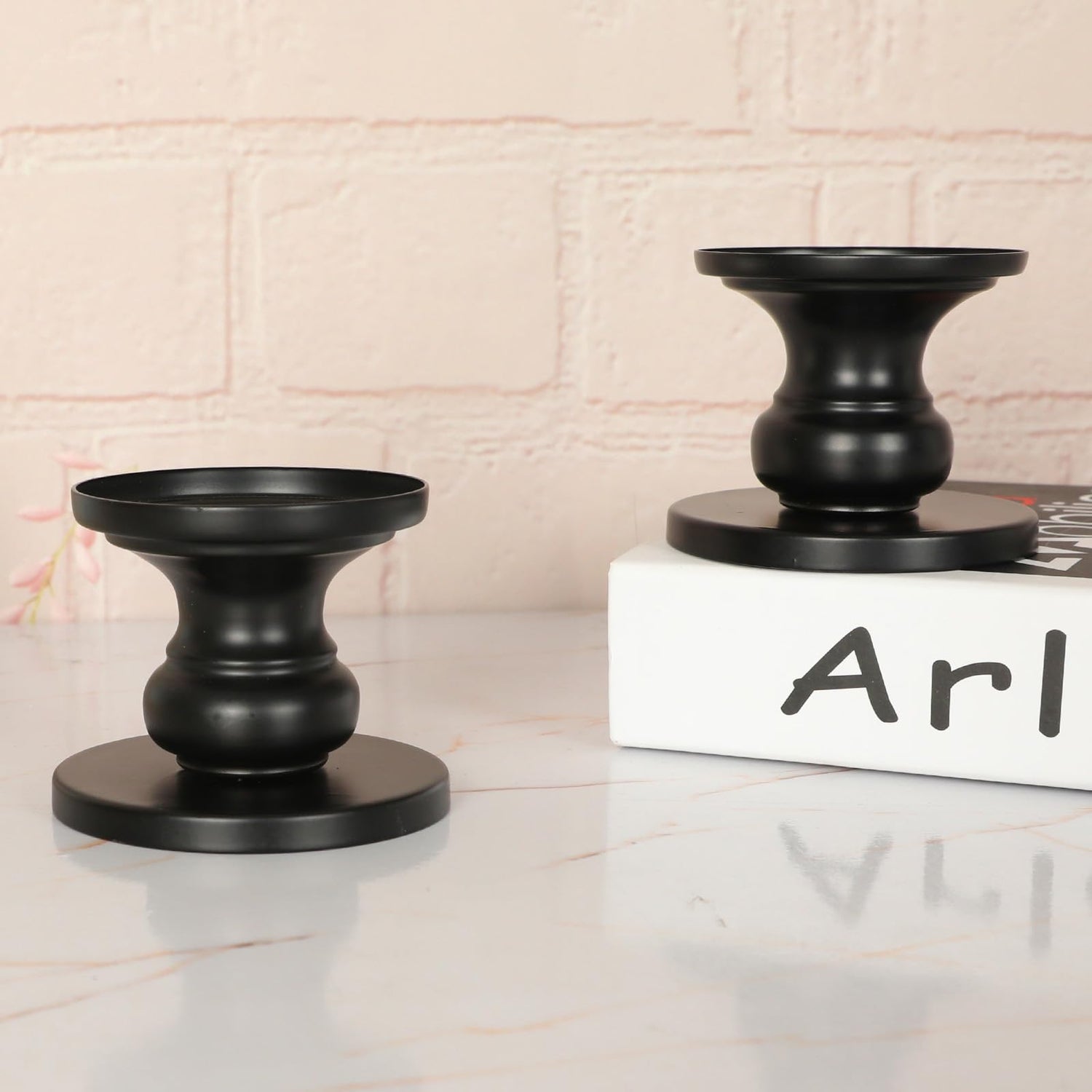 • 🕯️Elegant Matte Black: Elevate your décor with this set of 2 matte black iron pillar candle holders. The elegant and timeless design adds a touch of sophistication to any setting.