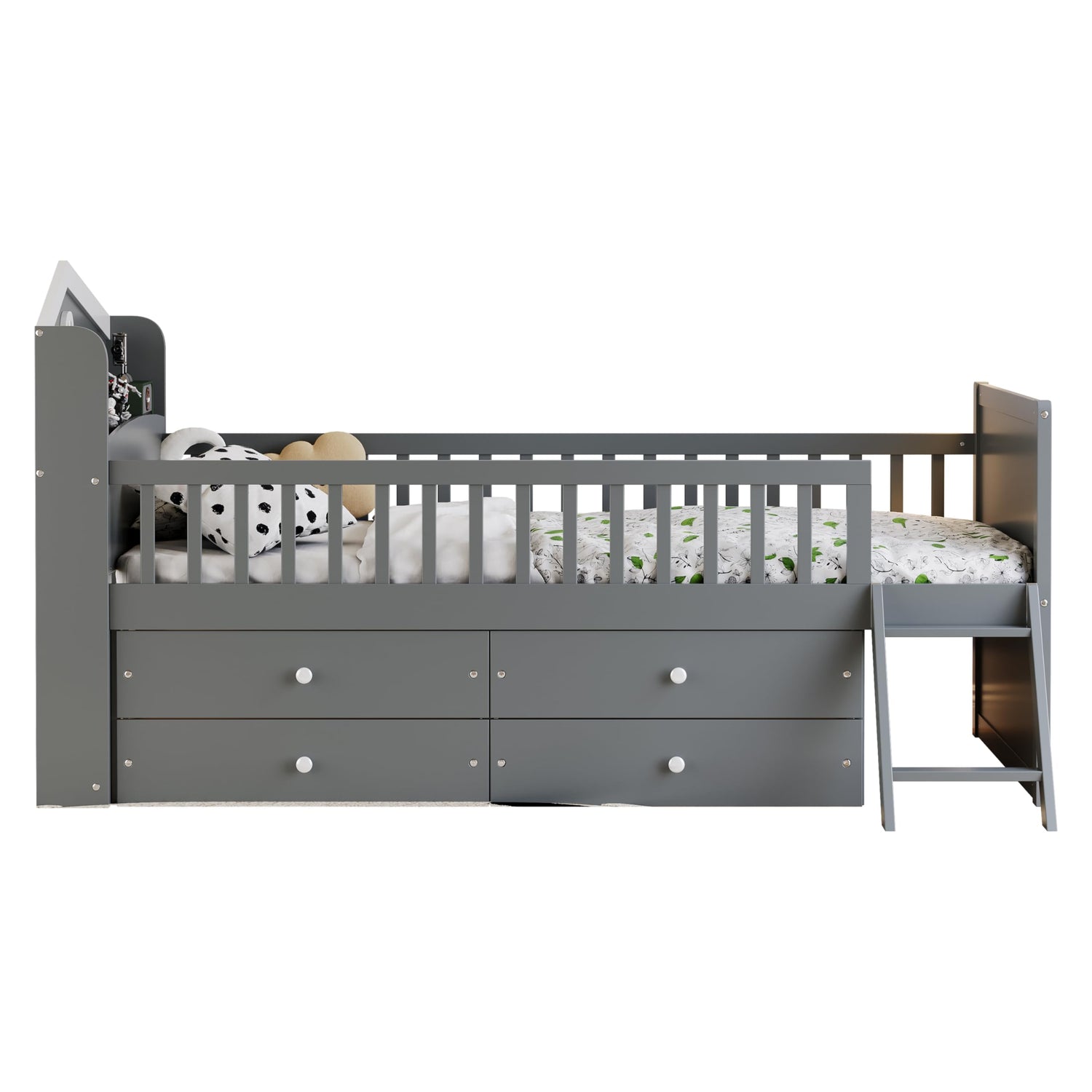 Details: This twin size wooden bed frame is designed with both functionality and style in mind. It features 4 spacious storage drawers, providing ample space to organize clothes, toys, and essentials. The headboard with a built-in shelf offers a convenient place for books, decorations, or night-time necessities. For easy access, the bed includes a sturdy 2-step stair and a protective guardrail, ensuring children's safety while climbing up and down. With its charming house-shaped headboard design, this bed creates a cozy and imaginative sleeping space, making it a perfect addition to any kid's bedroom.