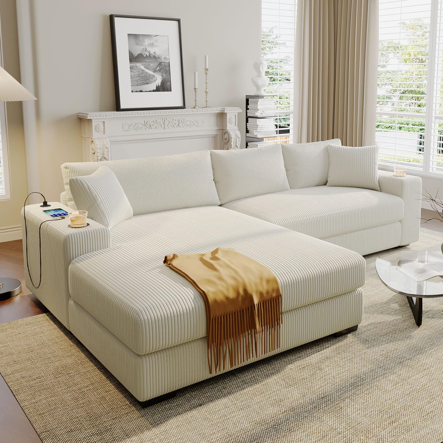 Merax Modern Oversized Corduroy Sectional Sofa with USB Charging Port,Cup Holder, Deep Seat Couch Sleeper Bed with 50" Chaise, Beige