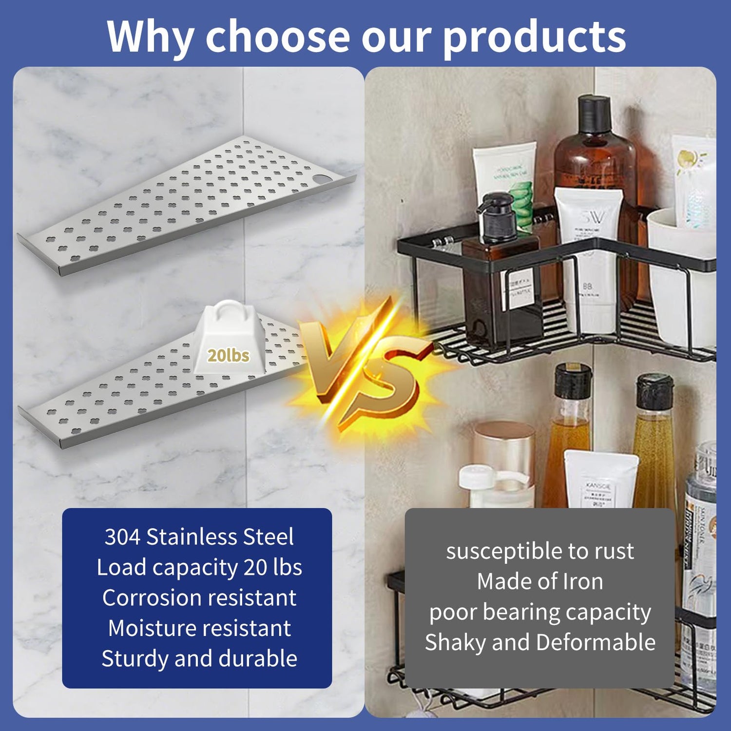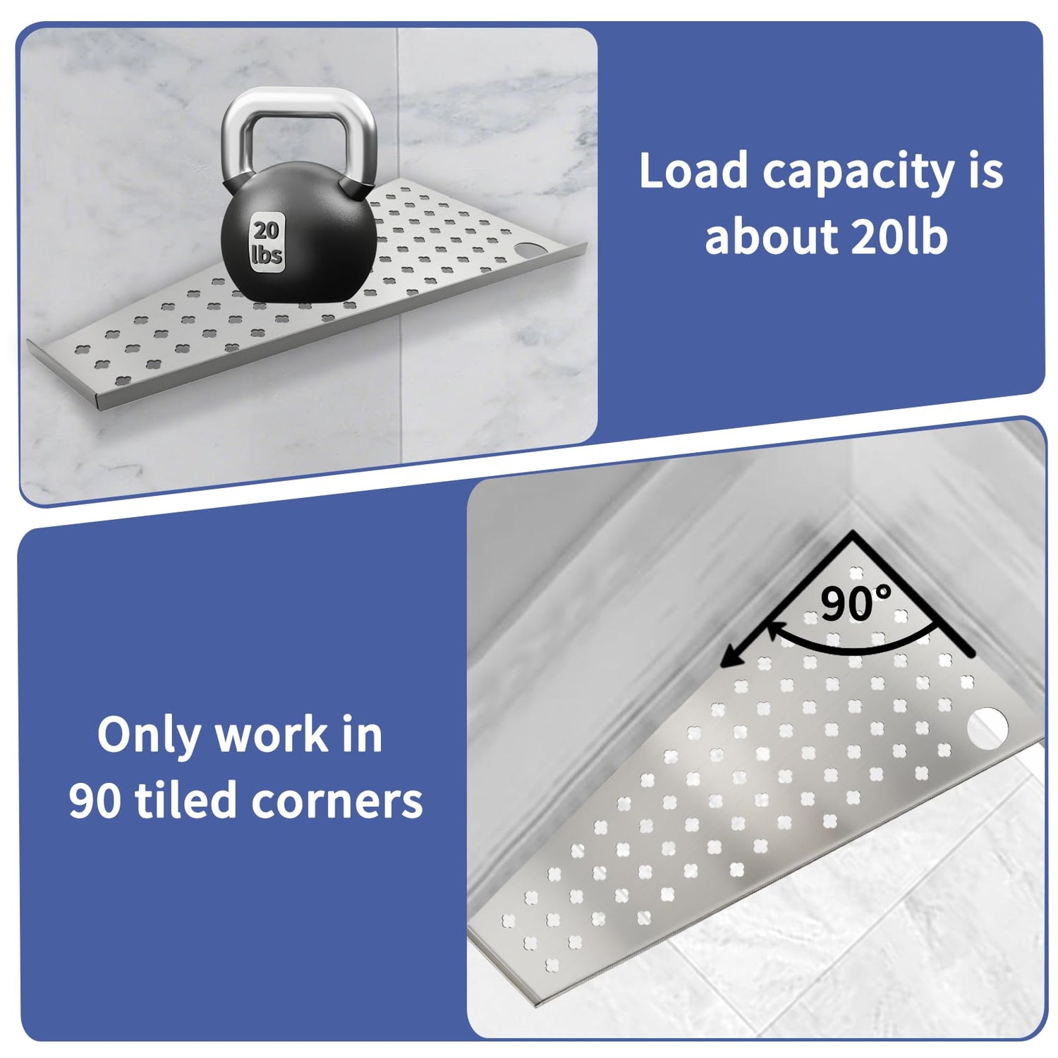 - 【Quality Shower Corner Shelf 】:12” shower corner shelf made of ASTM-certified SUS304 stainless steel with 1/16' (1.6mm) thickened panels, these corner shower shelves resist corrosion, scratches, and rust for lifelong durability. Each shower corner shelf holds up to 15 lb (6.8 kg), effortlessly supporting shampoo bottles, body wash, toiletries, or kitchen essentials. Perfect for tiled walls ,no screws.