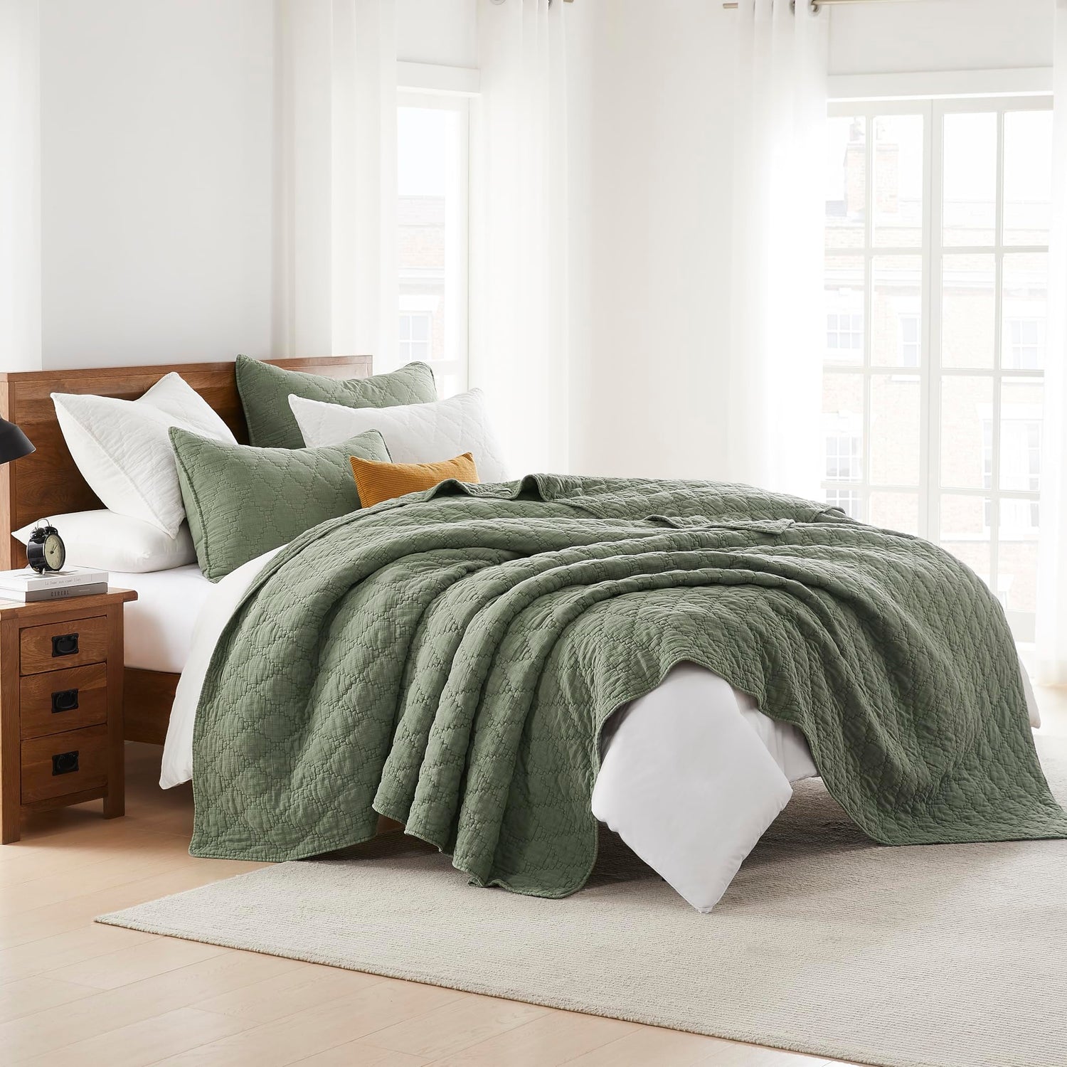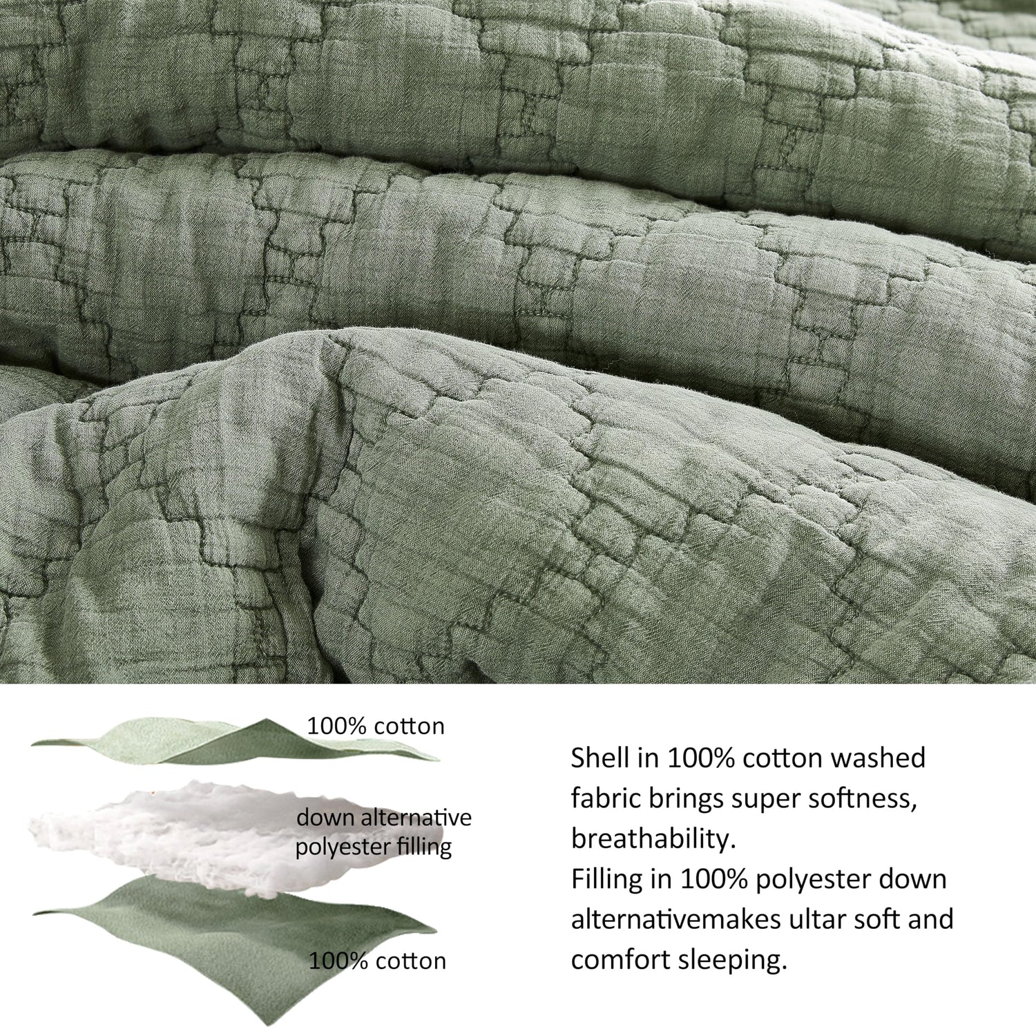 palassio Olive Green King Size Quilt Set, Muslin Cotton Shell Down-Alt Poly Filling, Soft Shabby Chic Rustic Farmhouse Country Bedspread, Textured Gauze Coverlet, Lightweight Bedding, 2 Shams