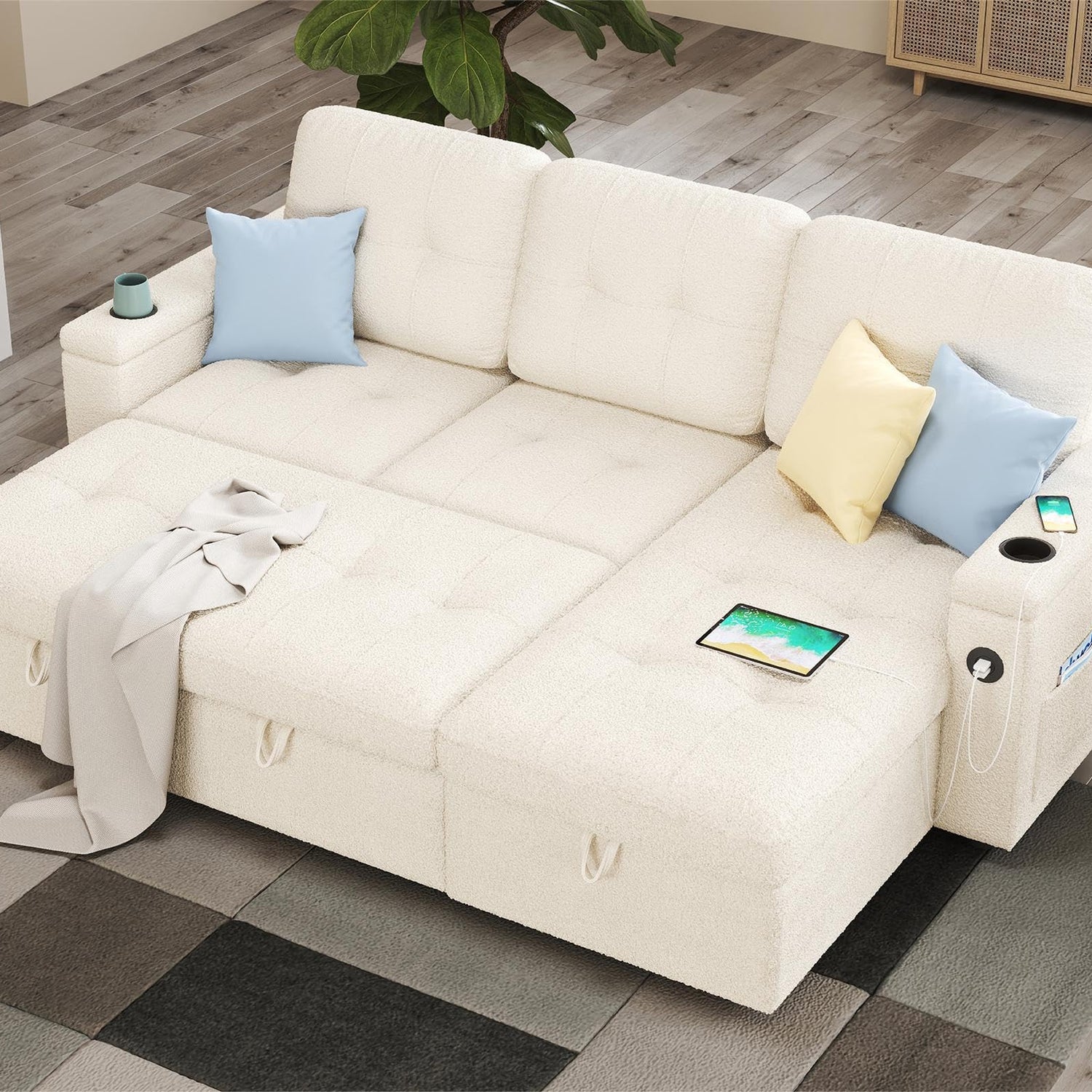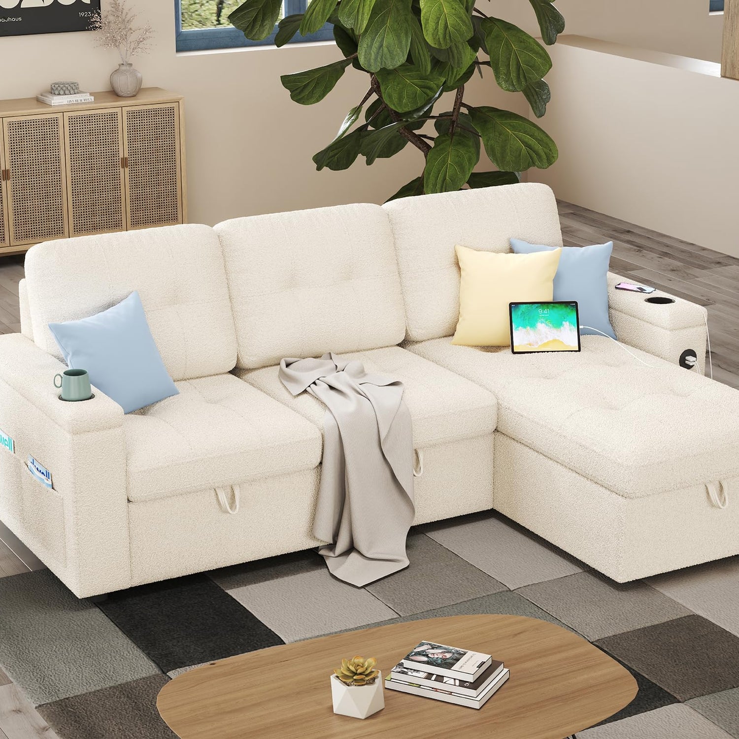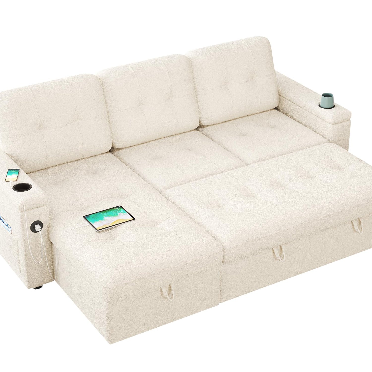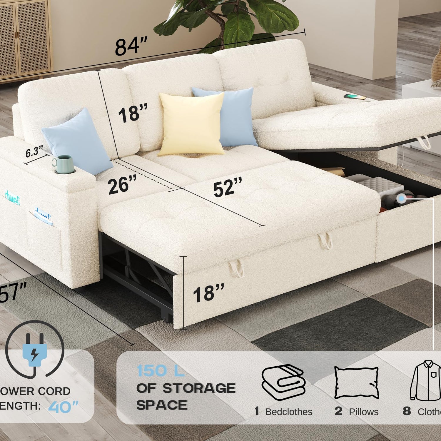 PaPaJet 84 Inch Pull Out Couch, Sleeper Sofa with Storage Chaise, Tufted L Shape Convertible Couch with 2 USB & Cup Holders, Boucle White