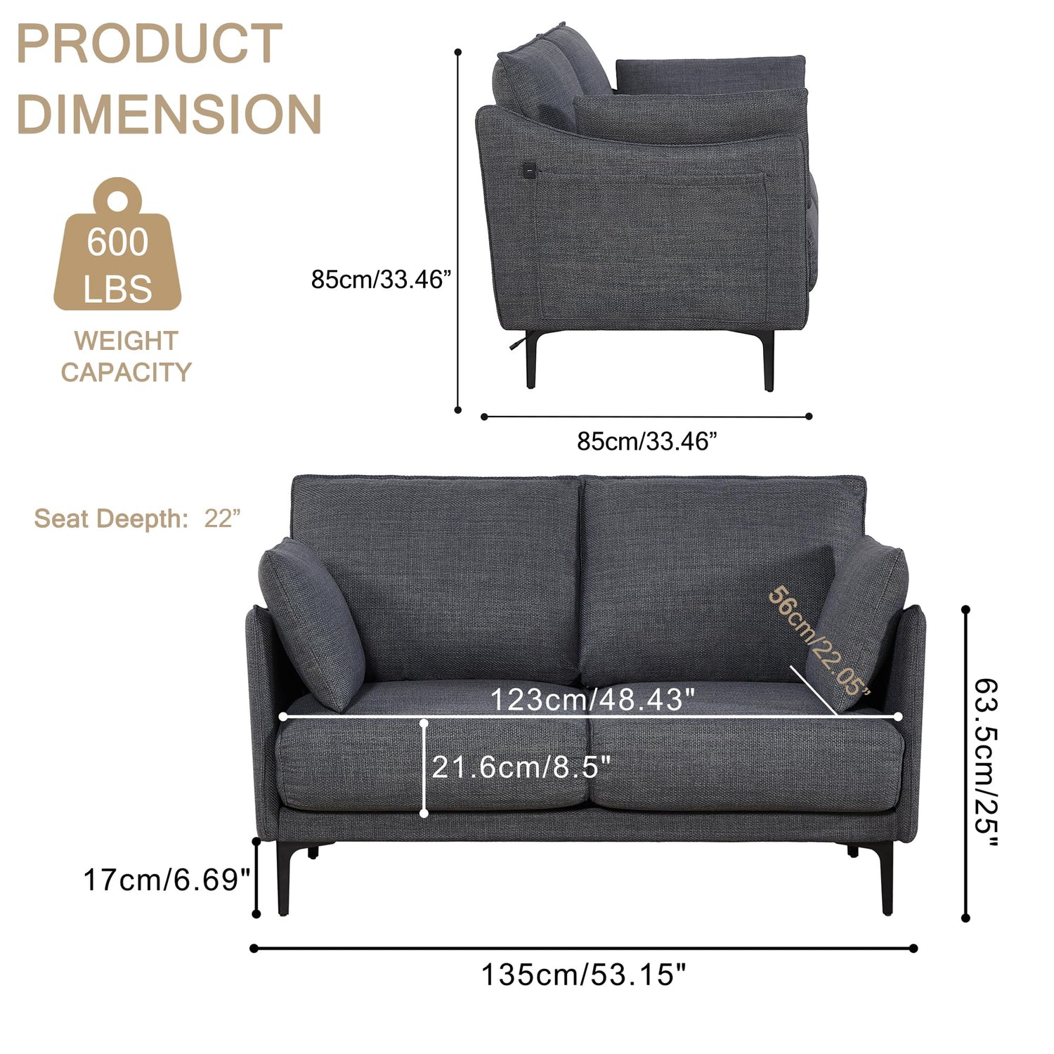 Plococo Simple Style Modern Loveseat Couch Sofa with USB Charge Port, 2 Pillows,Metel Legs for Primary Living Space, Bed Room, Office (Grey)