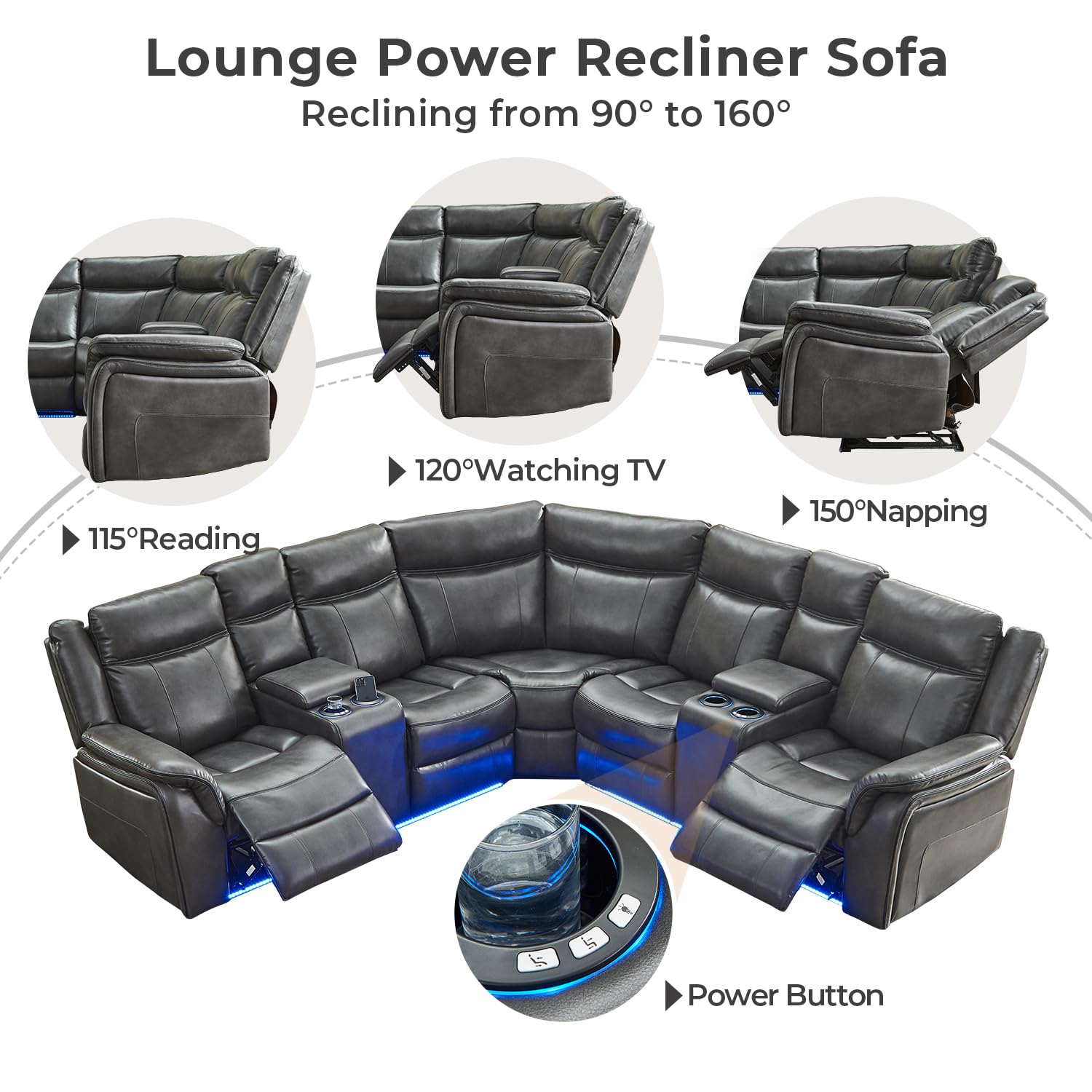 Power Recliner Sectional Sofa Couches with LED Lights for Living Room, Faux Leather Wall Hugger Reclining Corner Couch Sets with 2 Home Theater Seat, USB Charger, Cup Holder, Storage Console, Grey