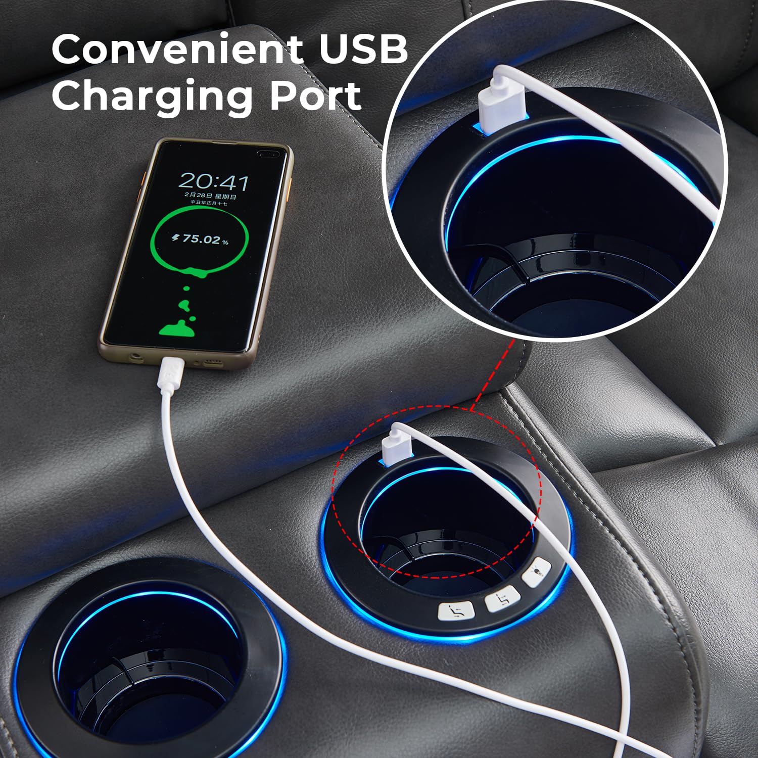 - Control system - This luxurious home movie sofa is designed to enhance your movie-watching experience. Equipped with 2 easy-to-use consoles, you can effortlessly control the stunning Led lighting and adjust the recliner mode to your preferred seating position. 4 built-in cup holders and 2 spacious storage spaces that cater to all your needs. Additionally, this sofa provides a USB function, allowing you to charge your electronic devices while you indulge in your favorite movies.