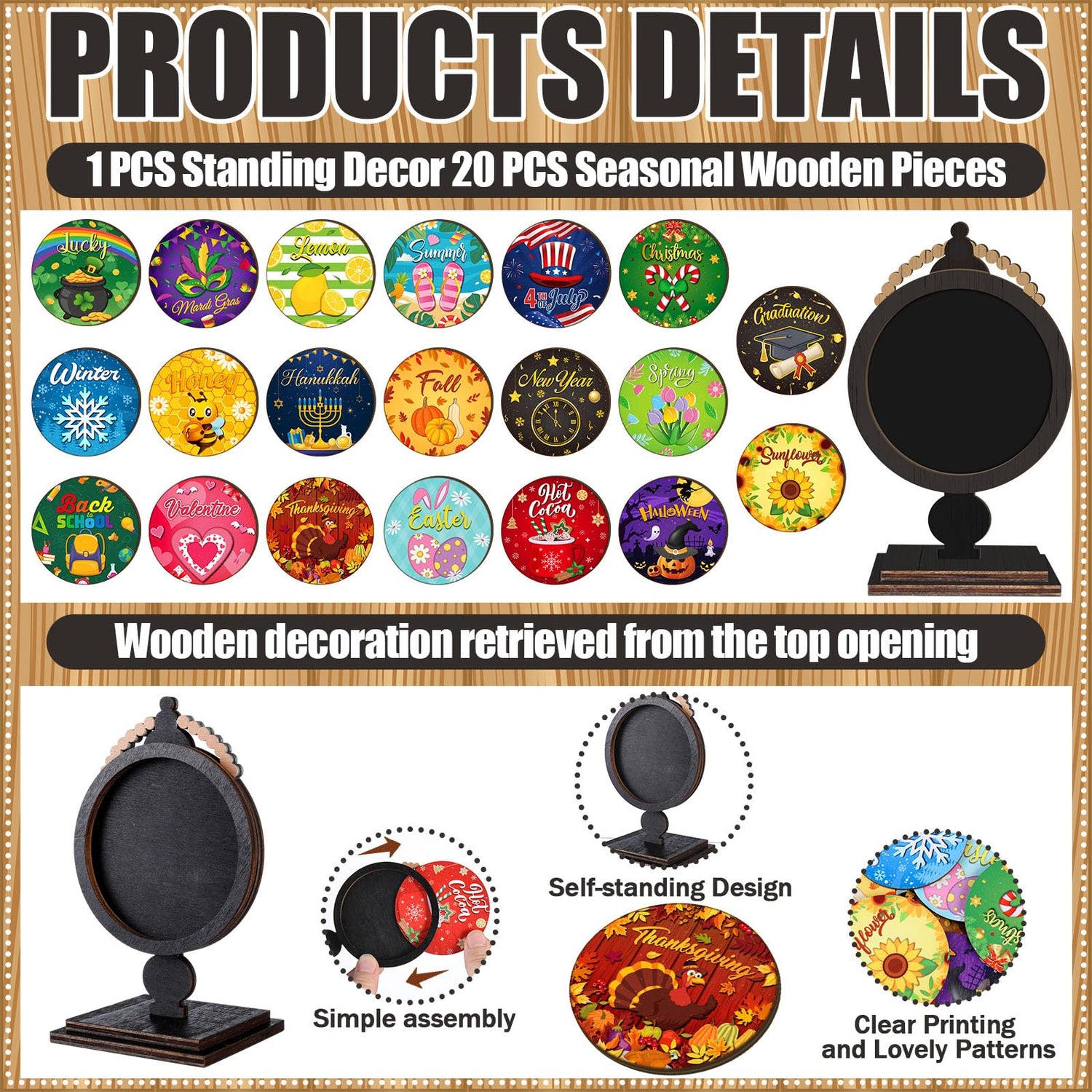 • Durable Material: crafted from durable wood, this interchangeable table decor is built to last through many holiday seasons; Its robust construction means it stands up well to regular use, maintaining its elegance and charm, Experience the smooth touch of the finely crafted wood, complemented by rich, vibrant colors that capture the essence of each season; This tactile feature adds a layer of sensory pleasure, making each interchange a delightful experience for your fall centerpieces and beyond