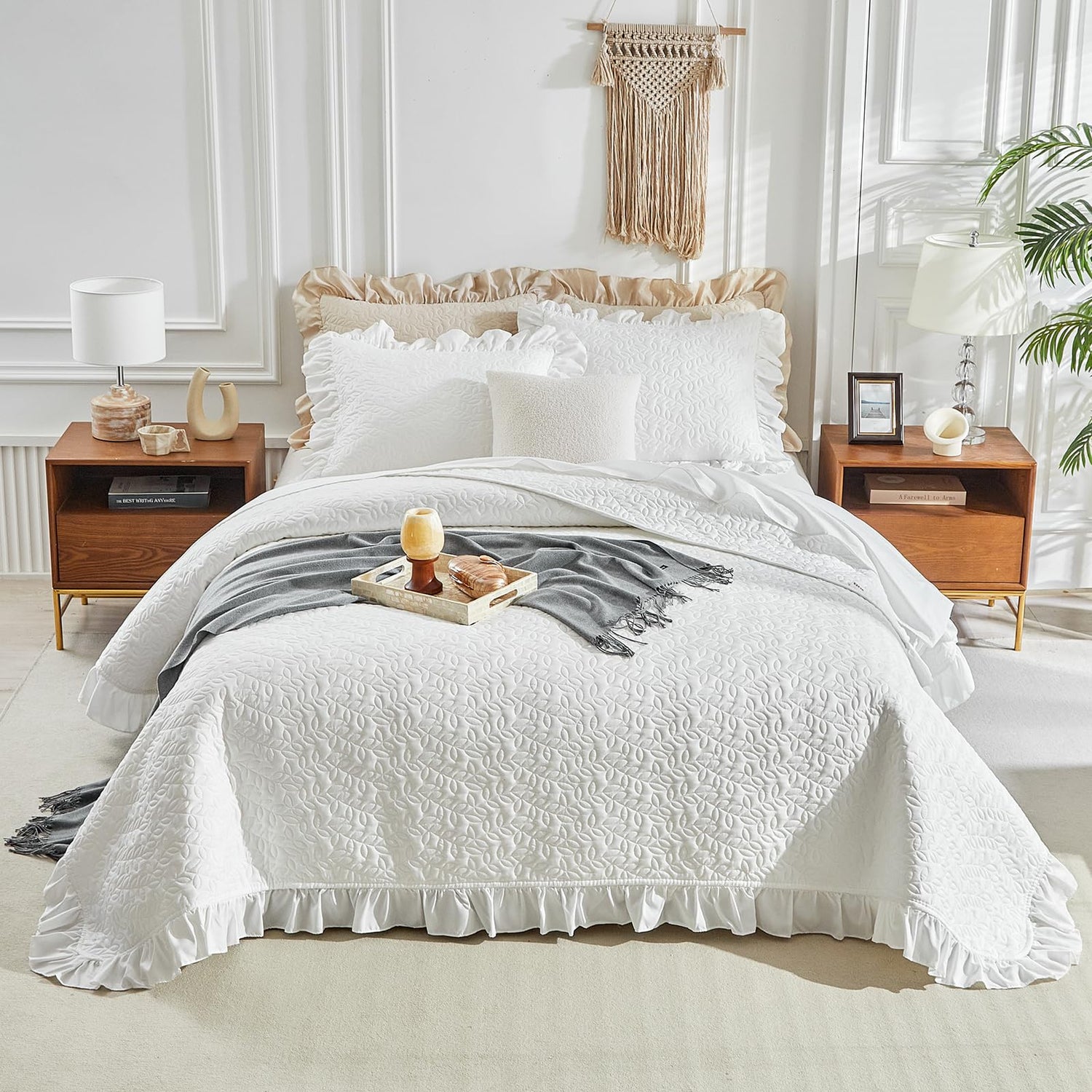 - GIFT IDEA: This ruffle fringe Quilt set looks elegance and romantic. The solid quilt features a simple style, which reduces your stress visually after a whole day of work and study. It will be a great gift for your family or friends on special occasions, birthday, Christmas Thanksgiving Day new year, holiday. We believe you all deserve the most elegant and comfortable quilt set! Try a new style for your bedroom