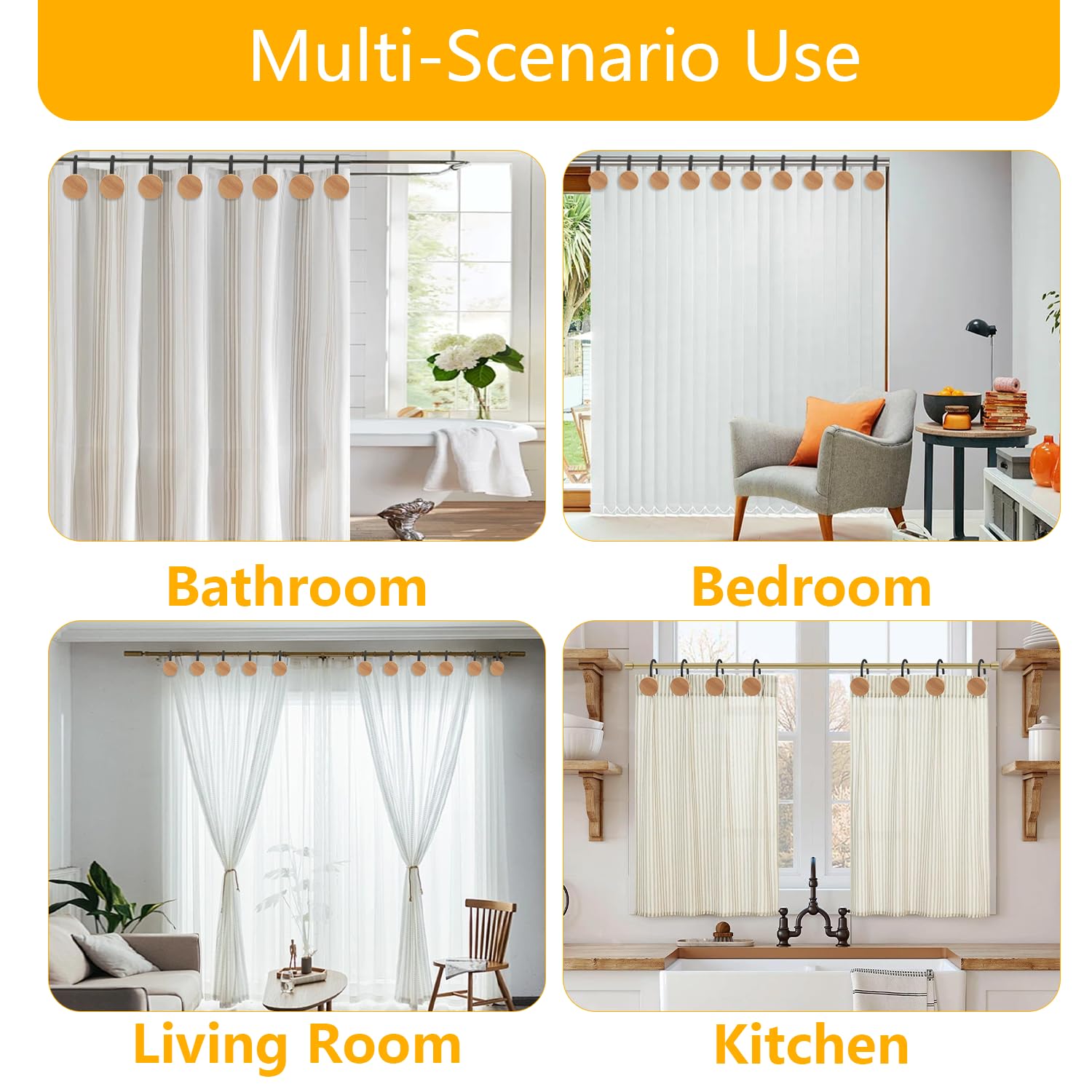 - 【Anti-Rust & Waterproof】Made of rustproof alloy and rounded wooden ends our curtain hooks for bathroom won’t tarnish or warp over time. Suitable for most colors and styles for shower curtains rods.
