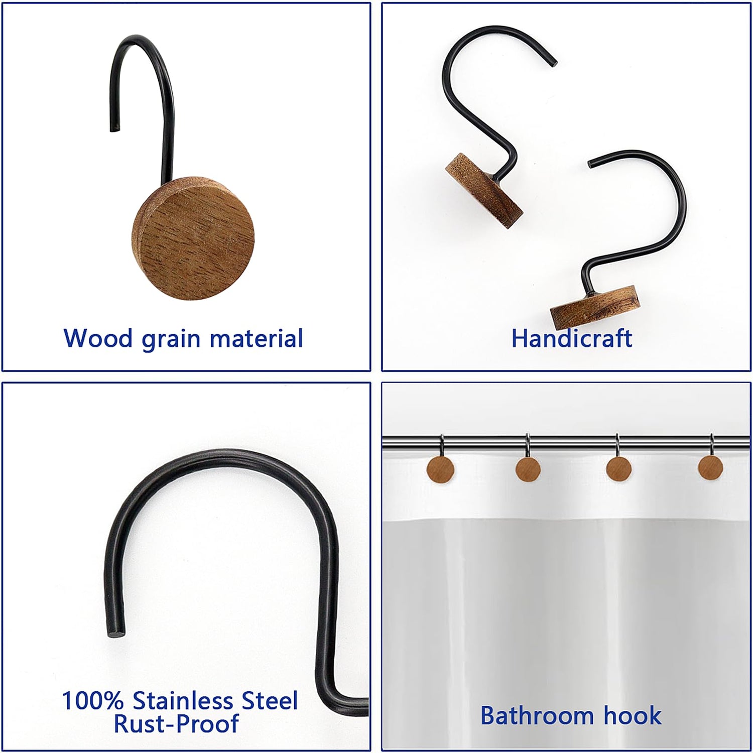 - 【Modern Natural Wood Design】These decorative shower curtain hooks are made of natural wood and electroplated iron, waterproof and rustproof. NOTE: EACH HOOK IS DIFFERENT SINCE EACH WOOD HAS DIFFERENT A GRAIN.