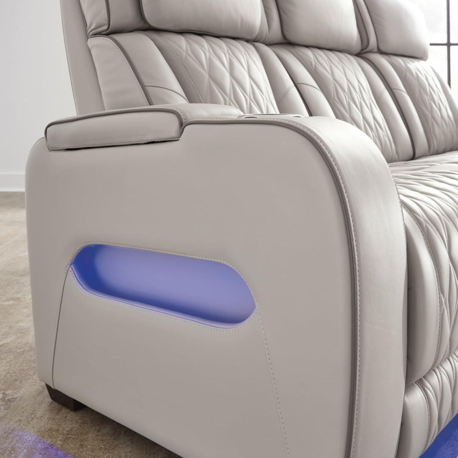 Signature Design by Ashley Boyington Contemporary Leather Match Power Reclining Loveseat with Console and USB Charging Ports, LED Lights and Adjustable Headrest, Light Gray