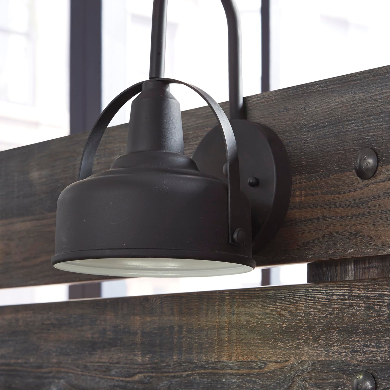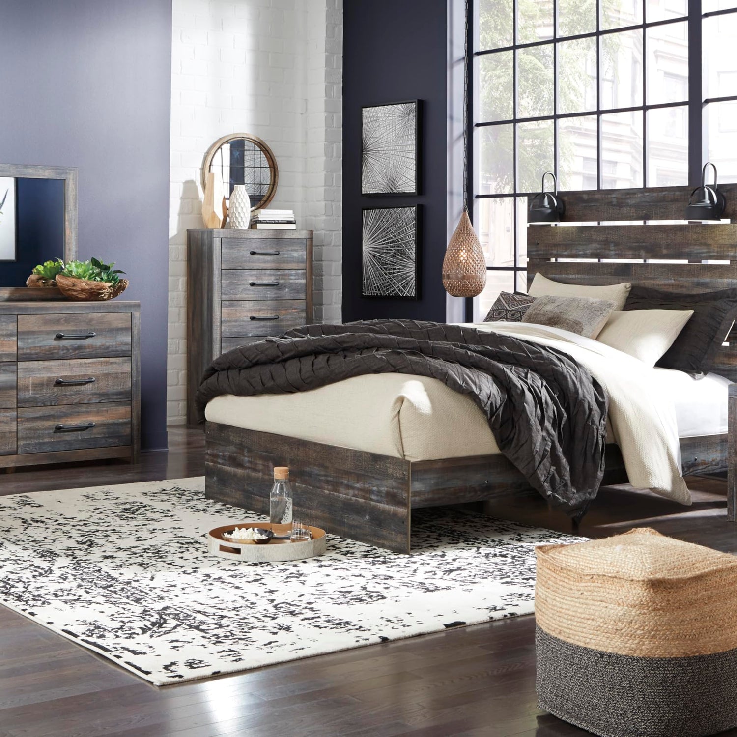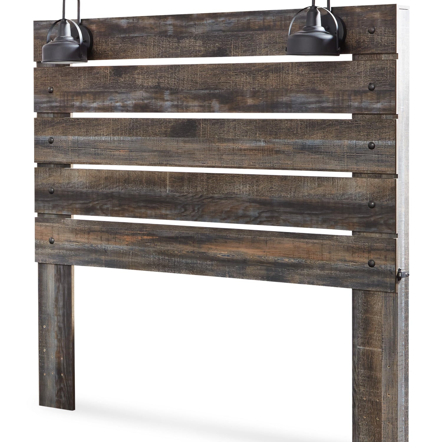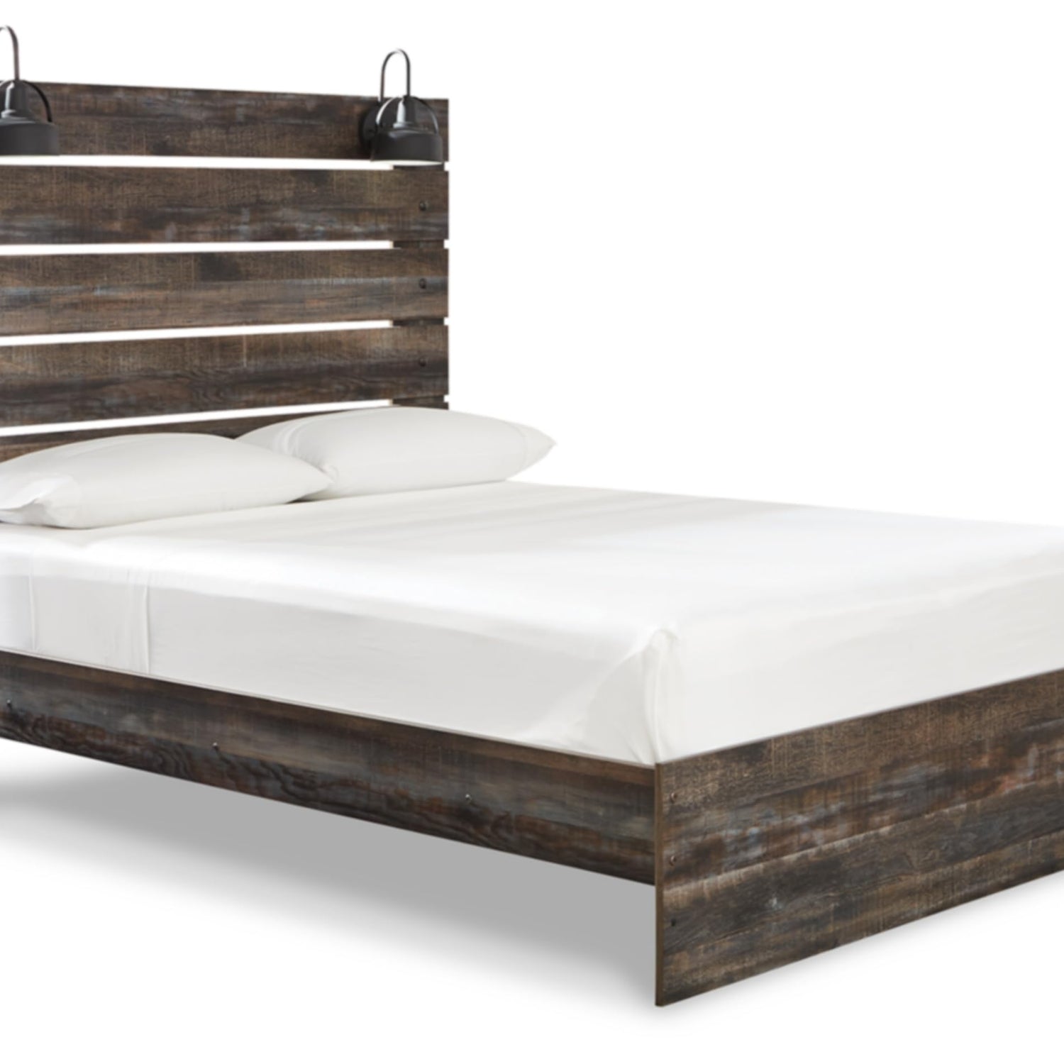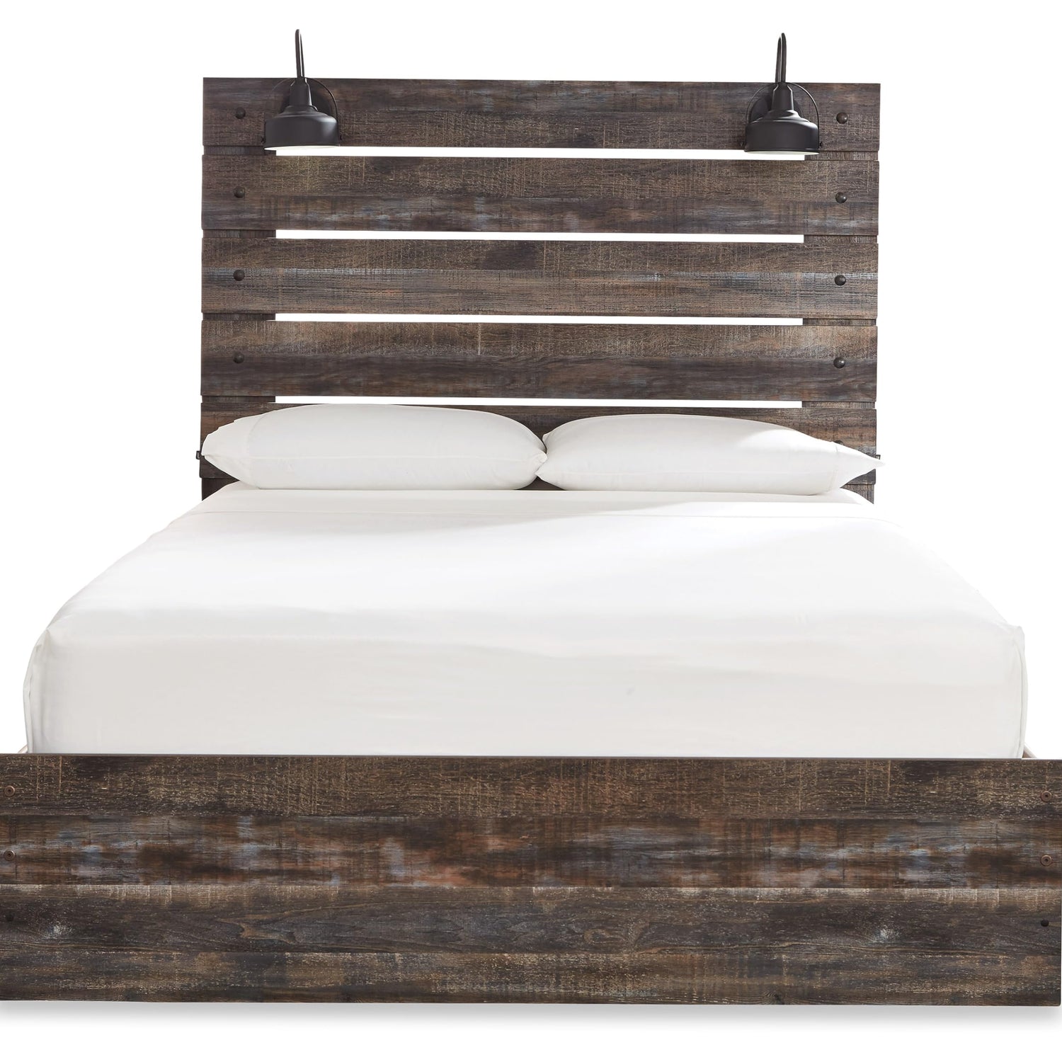Details: When merged in just the right way, rustic and industrial styles can make one happy marriage. Case in point: the Drystan queen panel bed. A refined take on barn board beauty, its complex, replicated wood grain showcases hints of burnt orange and teal tones for a sense of weatherworn authenticity. Love to read in bed? You’re sure to find the pair of retro-chic light sconces and USB plug-ins on the open-slat style headboard such a bright idea. Mattress and foundation/box spring available, sold separately.