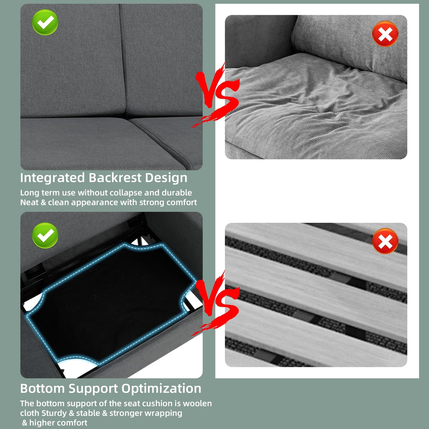 - [Ultimate Comfort] The backrest cushion of this two seat sofa boasts an integrated design, ensuring maximum comfort. Thick seat cushions, padded armrests, and soft back cushions are filled with high-density sponge and doll cotton, providing a plush feel that won't collapse easily. The fabric frame beneath the cushions offers a cloud-like soft wrapping, while the 105-degree tilt angle of the backrest and seat cushion conforms to ergonomic principles, allowing you to relax comfortably.