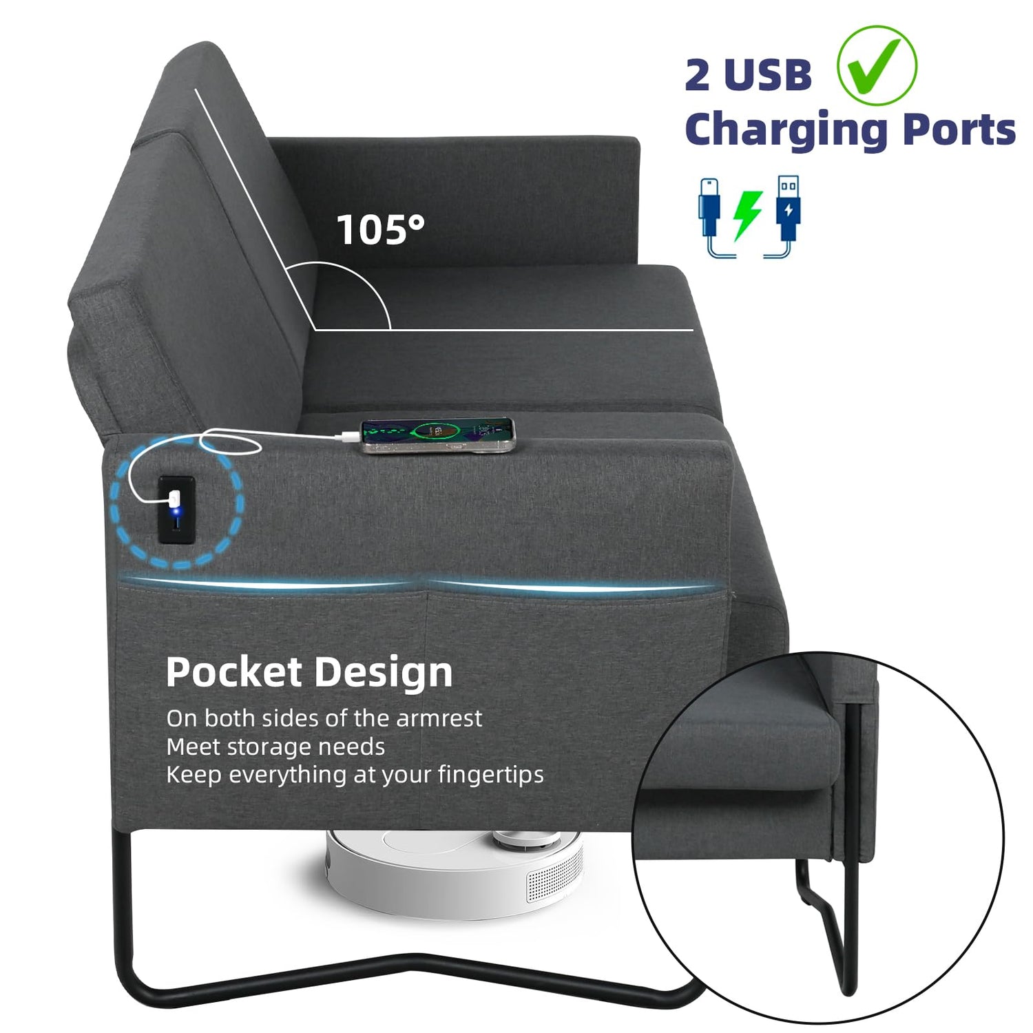 - [New Design] This small loveseat features 2 USB charging ports conveniently located on one side of the armrest, providing a long-term power supply for your devices while you enjoy gaming or watching videos. The pockets on both sides of the gray couch make it easy to store and retrieve items. Its unique W-shaped design and exposed iron legs showcase a mid-century modern style, making it a perfect fit for any small space.