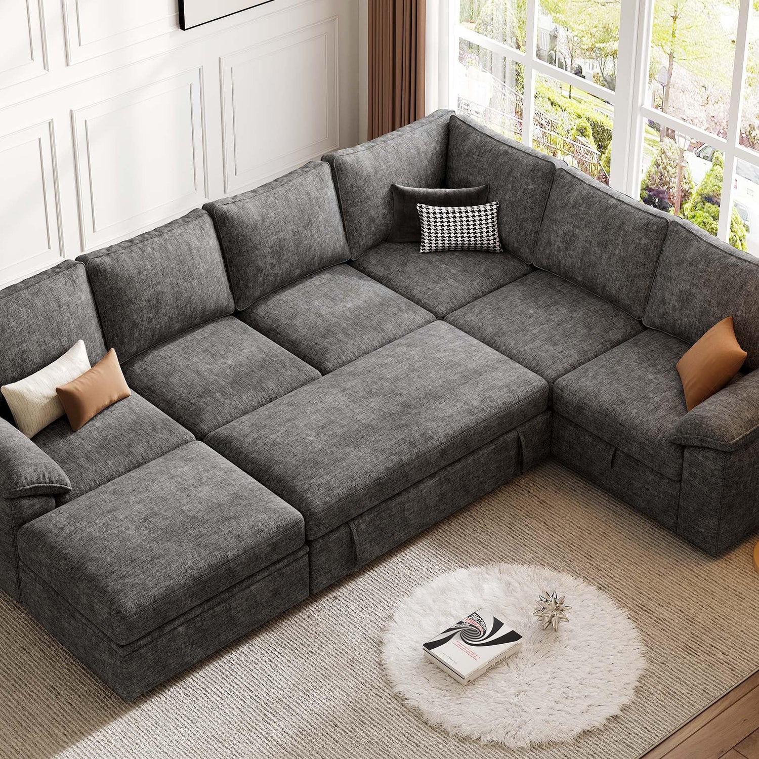SUAWY 108 Inch Sectional Sleeper Sofa with Pull Out Bed,U Shaped 7 Seat Modular Sectional Sofa with Storage,Sectional Couches for Living Room,Cloud Modular Couch,Removable Sofa Cover,Dark Grey