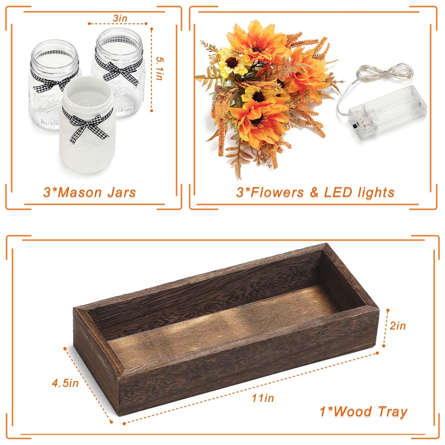 - 【Fall Decor Mason Jar Set】Package includes 3 harvest fall decorated Mason jars, 3 beautiful faux artificial bouquets and 1 rustic wooden tray. Multiple colors of farmhouse Mason jars can give you more decorating inspiration, and multiple sets can be combined to give you more flexibility to match your farmhouse table decor.