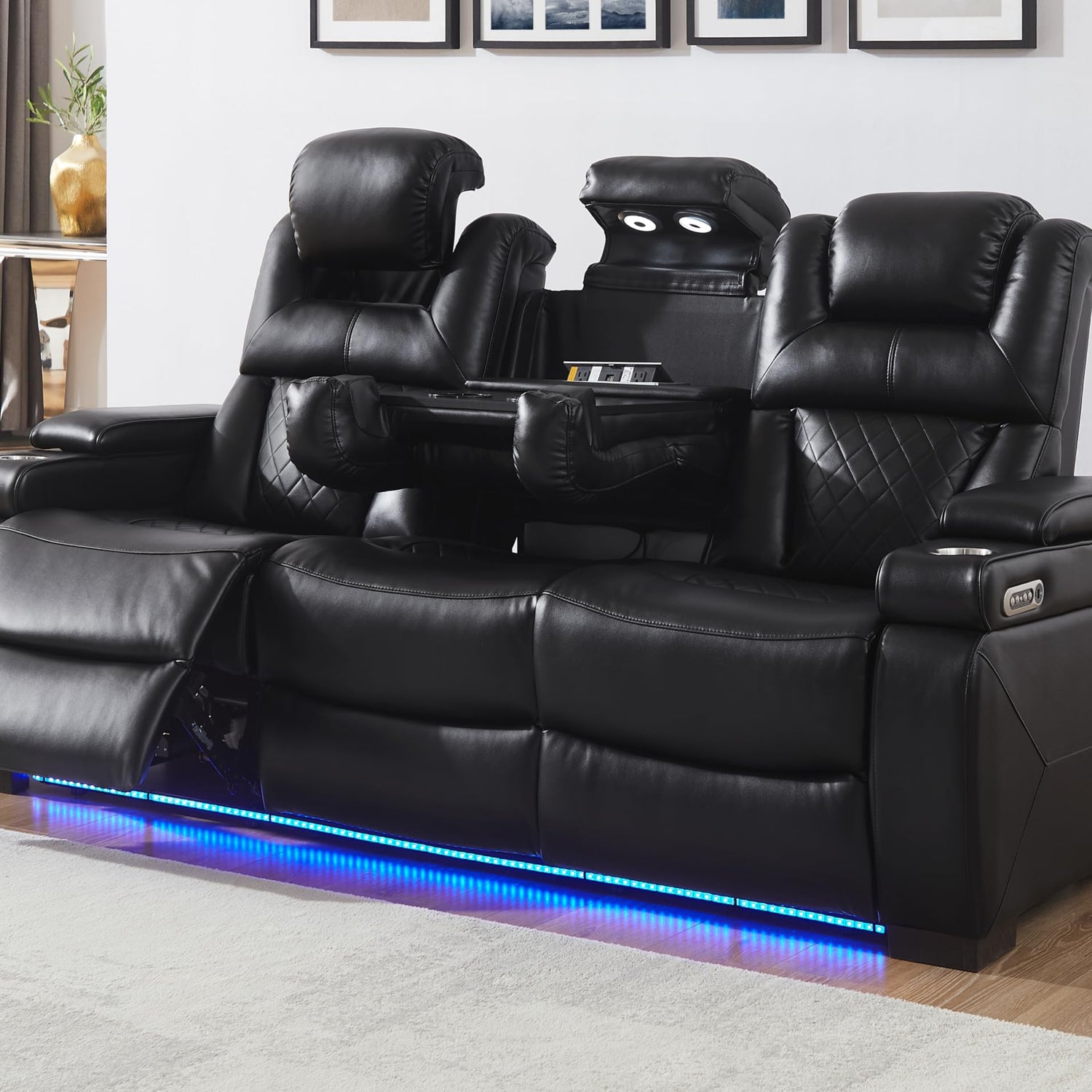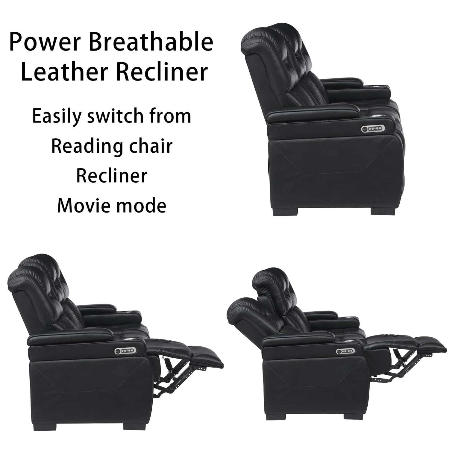 THSUPER Power Breathable Leather Reclining Sofa with LED Light, Home Theater Seating Recliner Couch with Adjustable Headrest/Reading Light/USB Port/Storage Arm/Drop Down Table for Living Room, Black