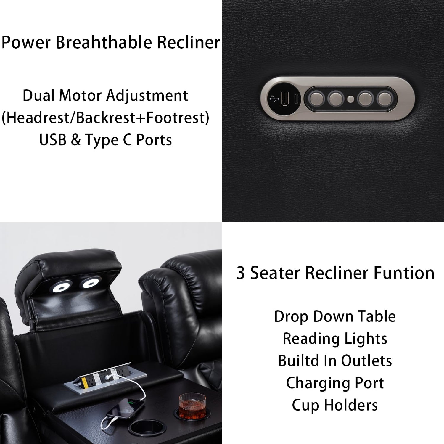 - 【Multi-functional Features】The 3-seater recliner sofa comes equipped with a reading light, USB charging port, cup holder, power outlets, and a unique drop-down table, ideal for holding books, drinks, or gadgets. All models feature adjustable headrests, LED lighting, and storage arms, bring a new color palette and space storage to your living space